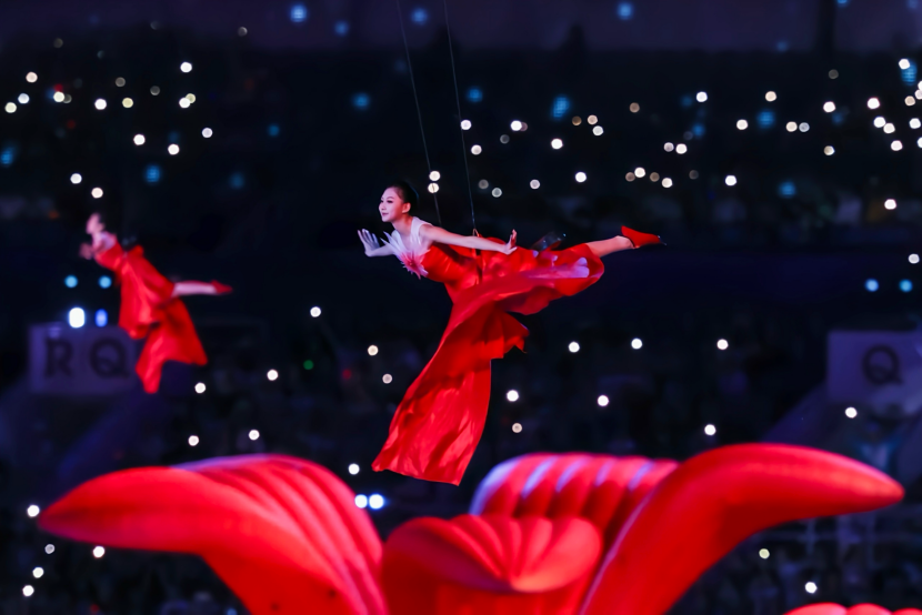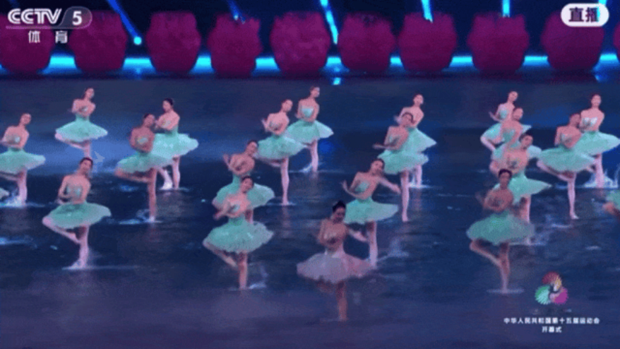 377名同学手持金色拉花,沿圆形舞台四圈列队,在运动员入场时展现整齐庄重的姿态,精准呼应开幕式“同心圆”创意核心;中心水舞台上,7位舞者与舞蹈家山翀同台献艺,身着灰色衣裤、佩戴红巾的舞者以“红色奋斗者”形象,用昂扬姿态传递奋进力量;动感体育秀环节,320名同学身着运动风服饰、背负绿、红、粉三色风车,57名国标舞专业同学在《水上嘉年华》中演绎活力拉丁舞,尽显运动与艺术交融之美;主题曲高光时刻,女同学乘秋千威亚“凌空而飞”,男同学全程协助,打造震撼视觉画面;音乐学院带来的暖场预热表演《羽动同心跃》,则提前点燃现场氛围,预告十五运精彩。