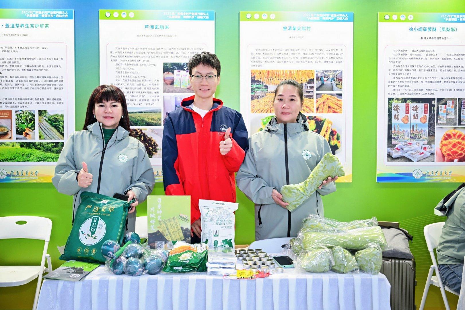 启动仪式前,会场外的“头雁”教学成果展与产品展示会已热闹启幕,成为本次活动的一大亮点。展区内分设四大板块,全方位呈现“头雁”项目培育成效与乡村产业活力。产品展示区里,来自三校学员的特色农产品琳琅满目,涵盖南药、丝苗米、油柑深加工产品、茶叶等各类优质成果,既展现了学员的产业实践成果,也为供需对接搭建了现场平台。