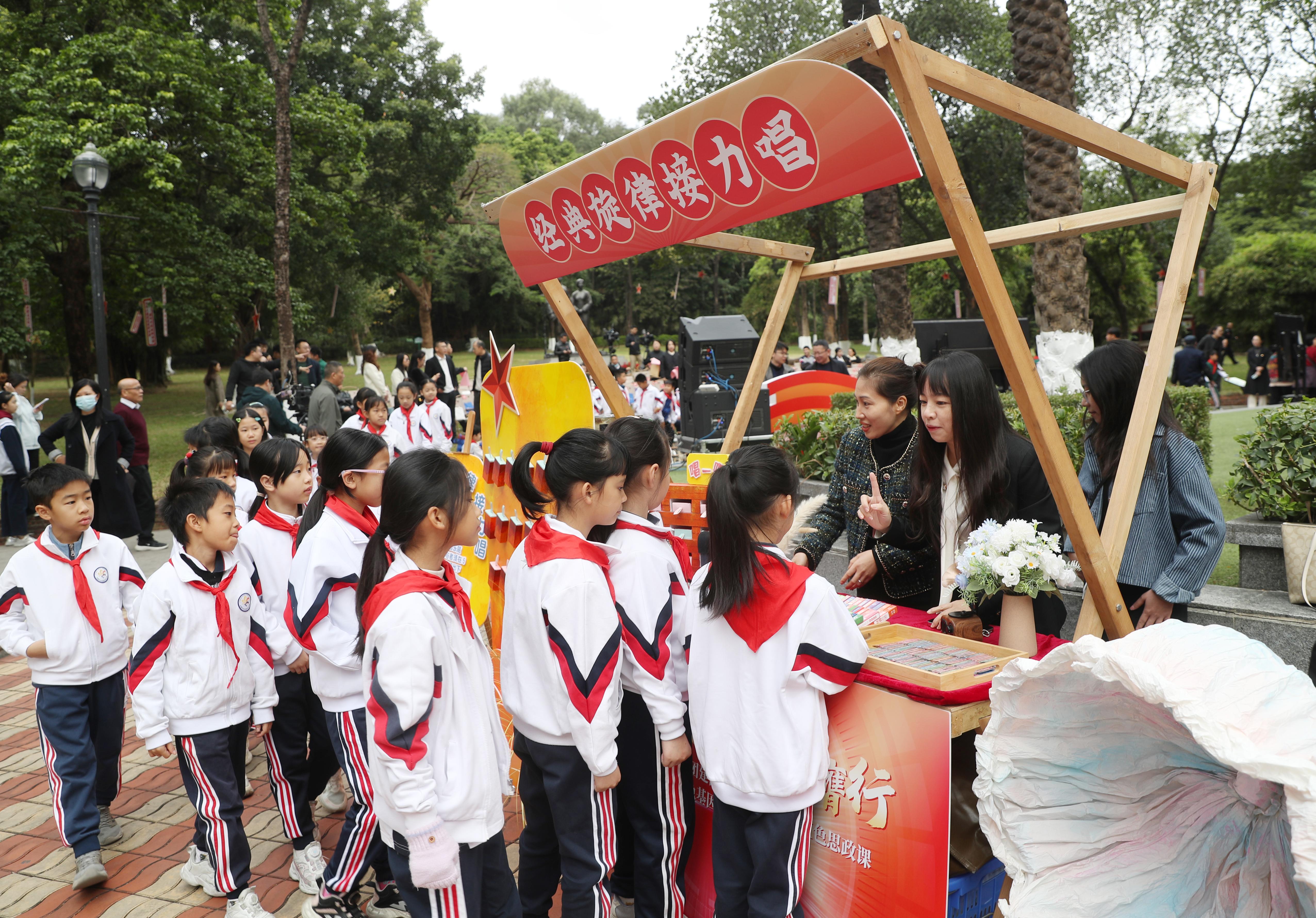 值得一提的是,整场活动紧紧围绕“体验”二字展开,设计了许多孩子能亲手做、亲身感的环节。例如由学生自主排演的红色话剧《岭南红荔情》,通过扮演叶挺、李秀文,让他们真正“走进”历史;舞台另一侧还设置了红色歌曲接力、历史拼图比赛等互动游戏,让孩子们从“听故事的人”,转变为“讲故事的人”。