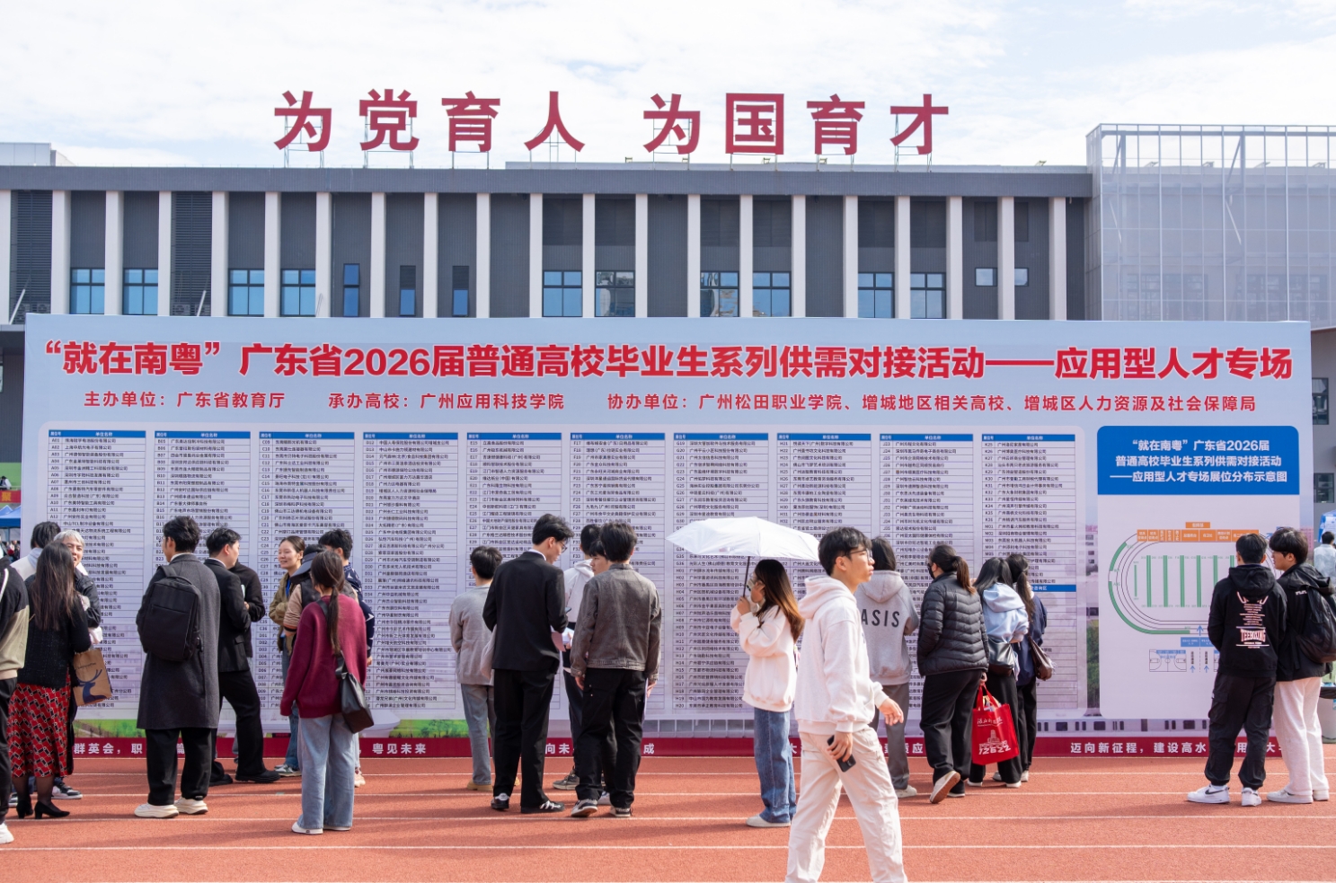 11月22日,由广东省教育厅主办、广州应用科技学院(以下简称“广应科”)承办的“就在南粤”广东省2026届普通高校毕业生系列供需对接活动——应用型人才专场招聘会,在广应科广州校区运动场举行。