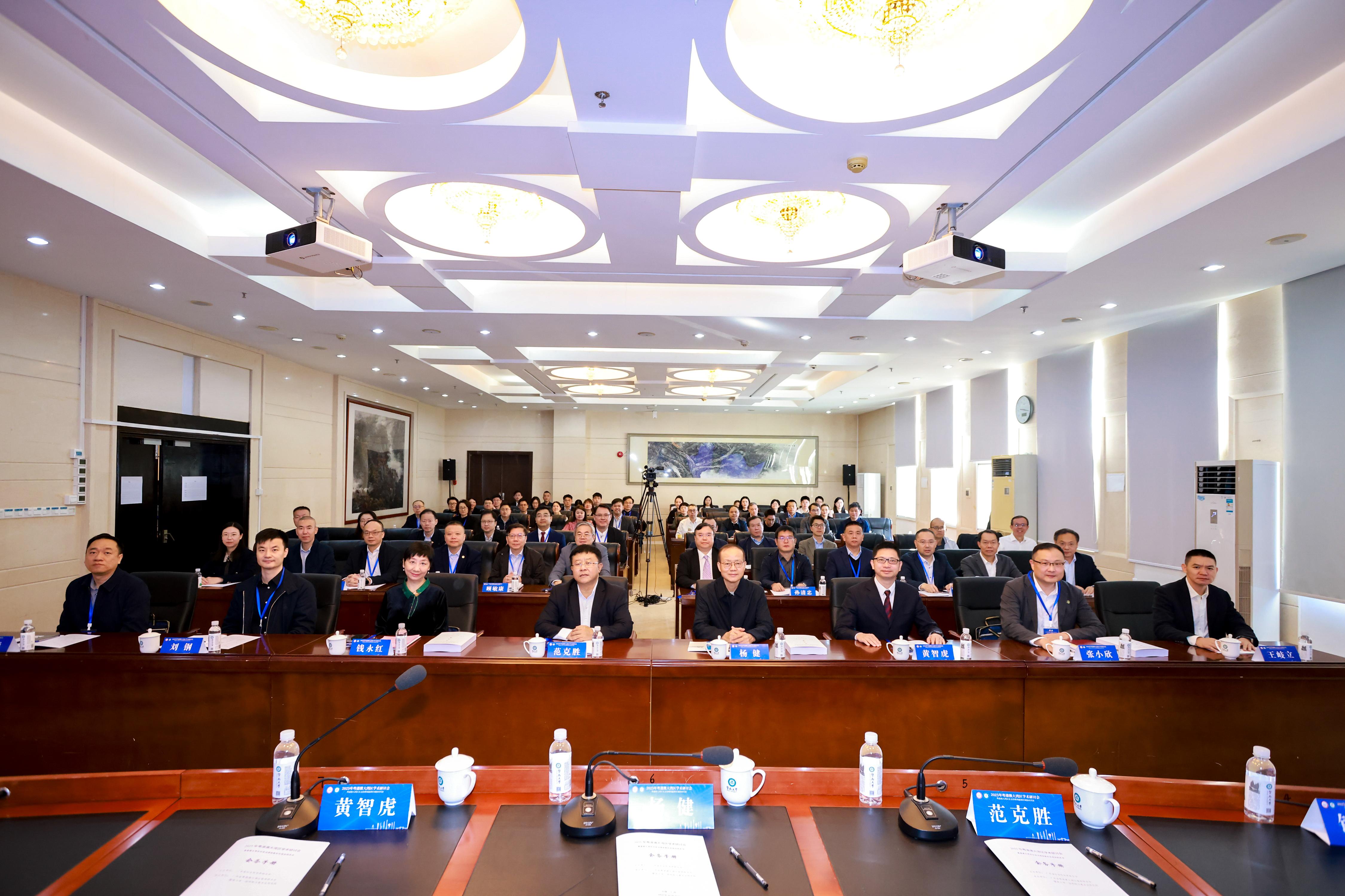 中央政府驻港联络办研究部、广东联络部和中央政府驻澳联络办研究室、广东省委港澳办、省委社会工作部、省社会组织管理局、省法学会等部门相关负责人,广东省粤港澳大湾区智库联合会部分理事、会员,省内相关高校、科研院所和北京师范大学、北京理工大学、华东政法大学、香港中文大学、香港科技大学、香港教育大学、澳门城市大学的专家学者近百人参加会议。
