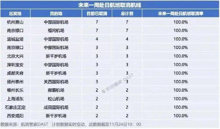 航班管家DAST的最新数据显示,截至11月24日10时,已有12条中日航线取消所有航班。此前,国内已有多个航空公司相继发布《关于日本相关航线客票特殊处理的通告》。