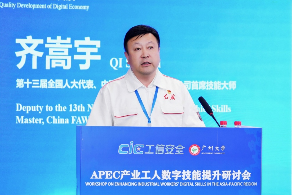 在主旨发言环节,第十三届全国人大代表、中国第一汽车股份有限公司首席技能大师齐嵩宇介绍了提升产业工人数字技能在赋能数字经济高质量发展中的作用;泰国数字经济与社会部数字经济促进局数字人力开发与促进处副总裁贾卡尼·卡纳努拉克(Jakkanit Kananurak)介绍了泰国的数字化演进;印度尼西亚通信与数字事务部国际事务中心行政主管于加·桑坎·普拉塞提亚(Yoga Sangkan Prasetya)介绍了印尼2045数字愿景:劳动者数字扫盲计划。