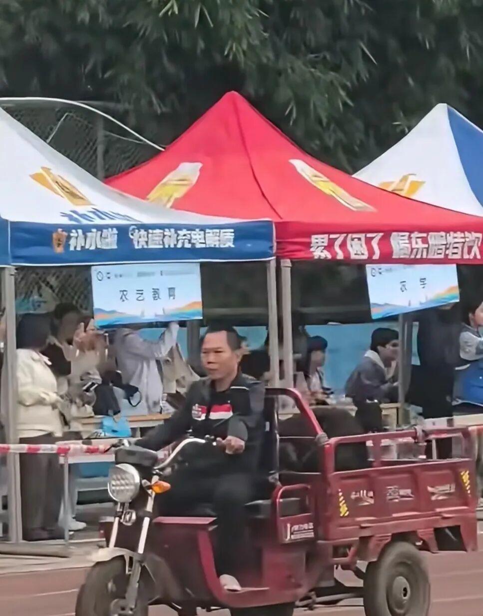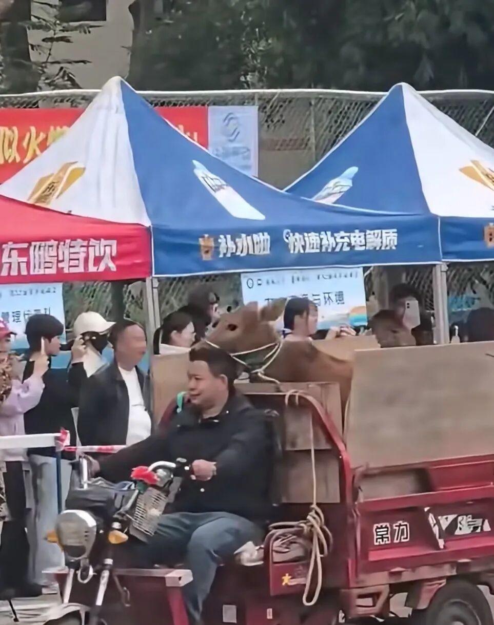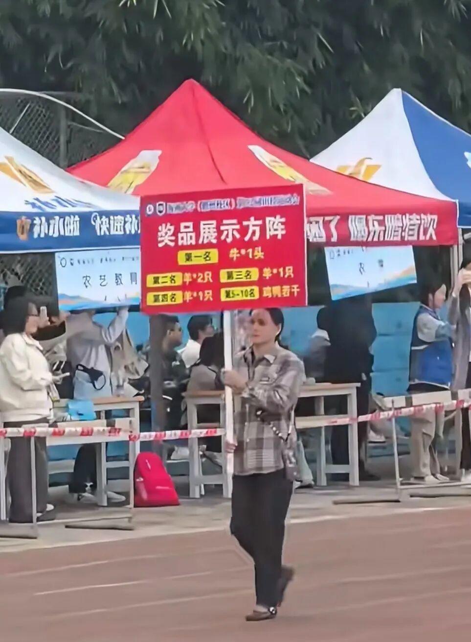 根据学生的视频,一女生举着红色牌子走在最前,牌子上写着“奖品展示方列:第一名,牛1头;第二名,羊2只……第5-10名,鸡鸭若干。”跟在举牌女生后面的,则是一辆辆三轮车,上面装着牛、羊、鸡、鸭等动物,场面滑稽。而在奖品展示方列进场时,现场同学爆发大量笑声,纷纷举着手机拍视频。