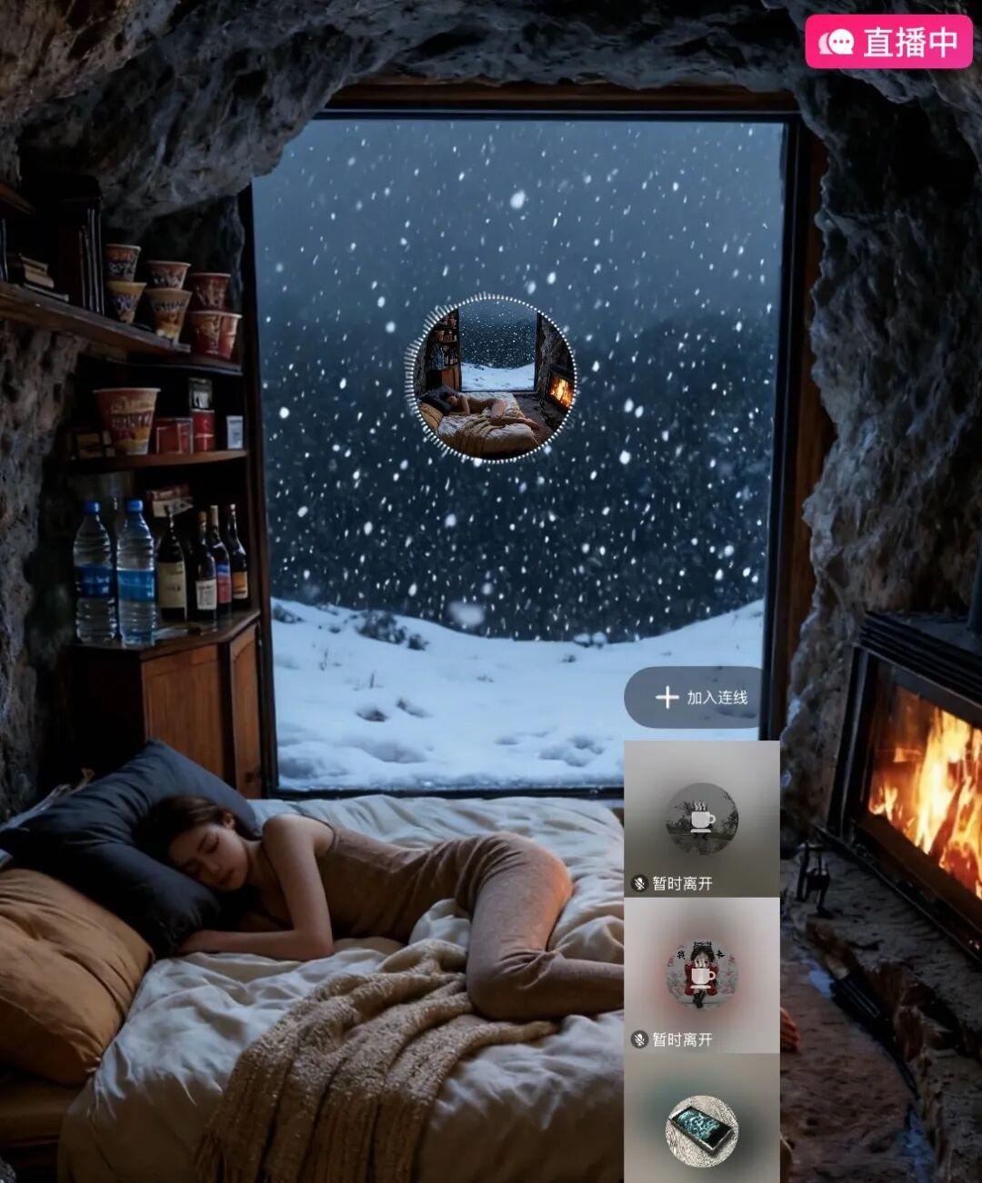 窗外是极端天气,看上去不适合出门。房间内点着一团噼啪作响的篝火,角落里还有充足的物资来捱过这个冬天……这里看起来像是世界末日场景下的庇护所,在每天晚上,你都能在抖音和B站的直播间内找到这些由AI生成的安全屋实景视频,它们正陪伴着很多人,度过一个又一个不眠之夜。