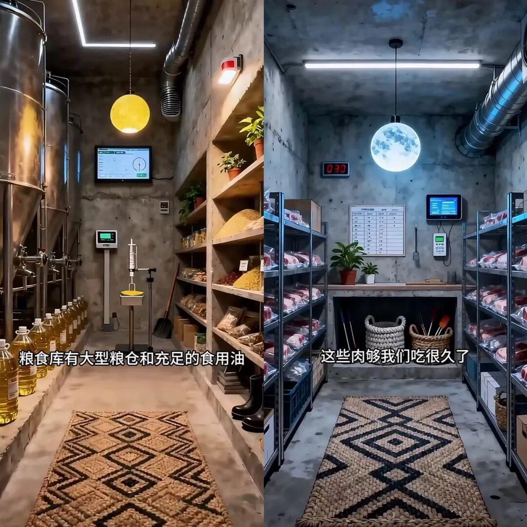 AIGC的加持,让叶公好龙的生存狂们也有了去处,他们的想象力很快转变成了虚拟现实中的生产力。我刷到过一个最戒备森严的末日庇护所——它的入口设在悬崖一侧的内嵌道路中(以避免从山下被观测到),用防爆金属门与外界隔绝,进入庇护所需先经过消毒室全面消毒,还可在监控室查看屋子内外的全部画面,弹药库,冷藏库,蔬菜种植区更是应有尽有……只能说要比起绝地求生,我们真不虚任何人。