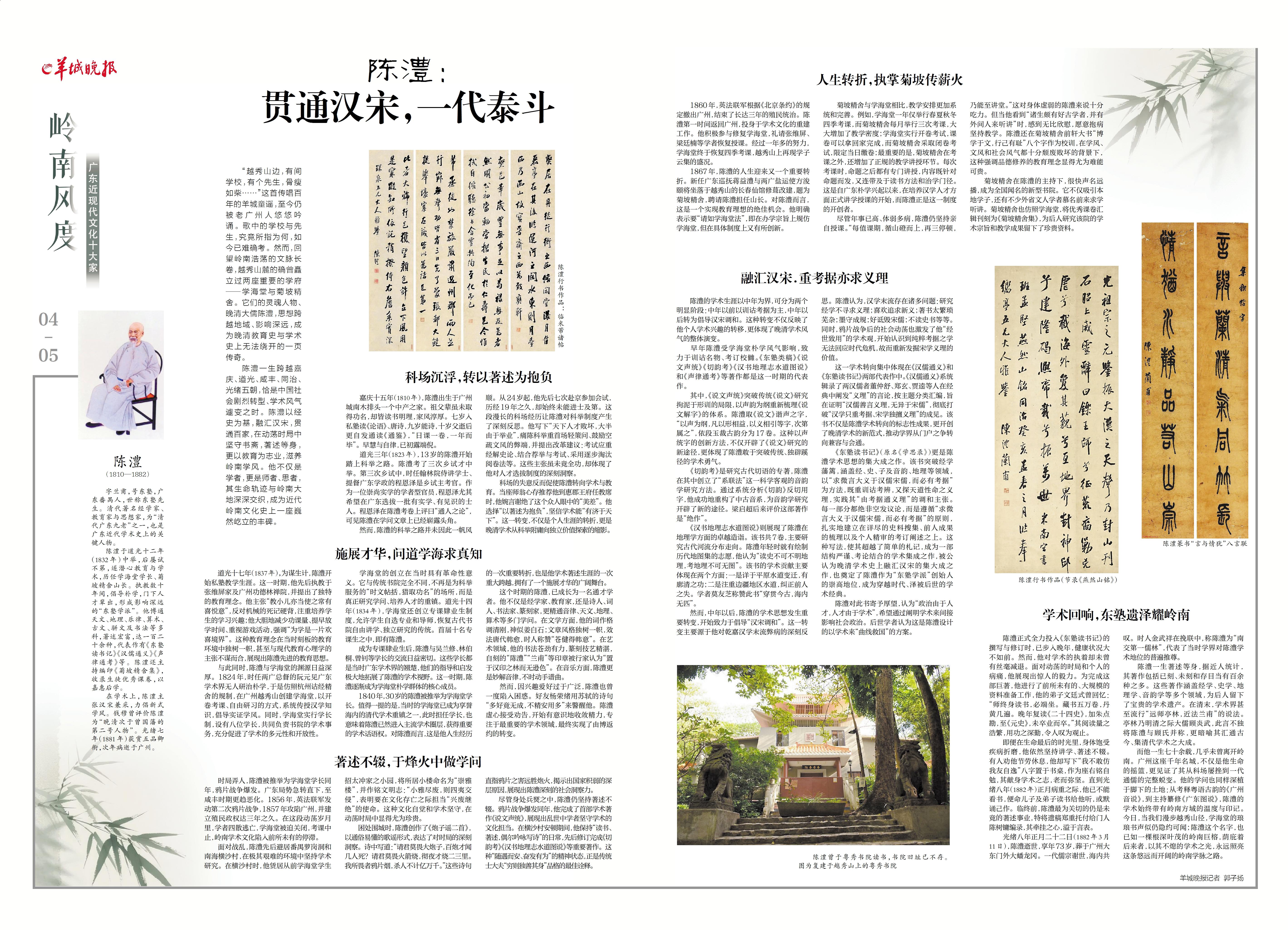 陈澧一生跨越嘉庆、道光、咸丰、同治、光绪五朝,恰是中国社会剧烈转型、学术风气遽变之时。陈澧以经史为基,融汇汉宋,贯通百家,在动荡时局中坚守书斋,著述等身,更以教育为志业,滋养岭南学风。他不仅是学者,更是师者、思者,其生命轨迹与岭南大地深深交织,成为近代岭南文化史上一座巍然屹立的丰碑。