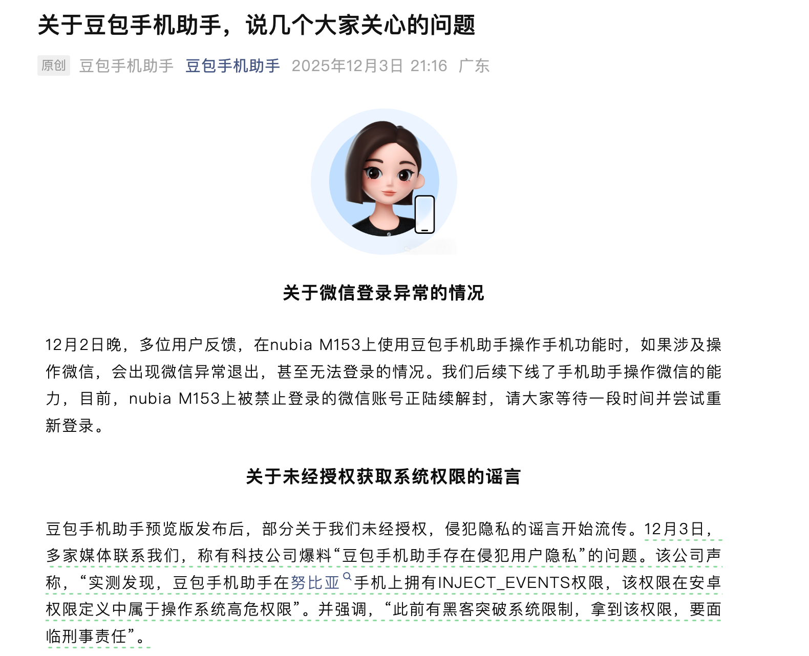 豆包手机助手今日晚间发文,对“微信登录异常”“未经授权获取系统权限”以及保护用户隐私等问题作出回应。