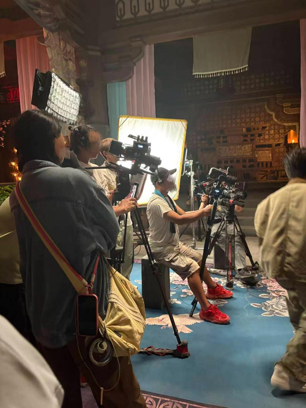 一场戏结束,用过午饭后,剧组转场至另一个片场。新的场景是宫殿内部,悬挂了几盏古色古香的灯,几条粉色、蓝色的薄布料从天花板上垂下。