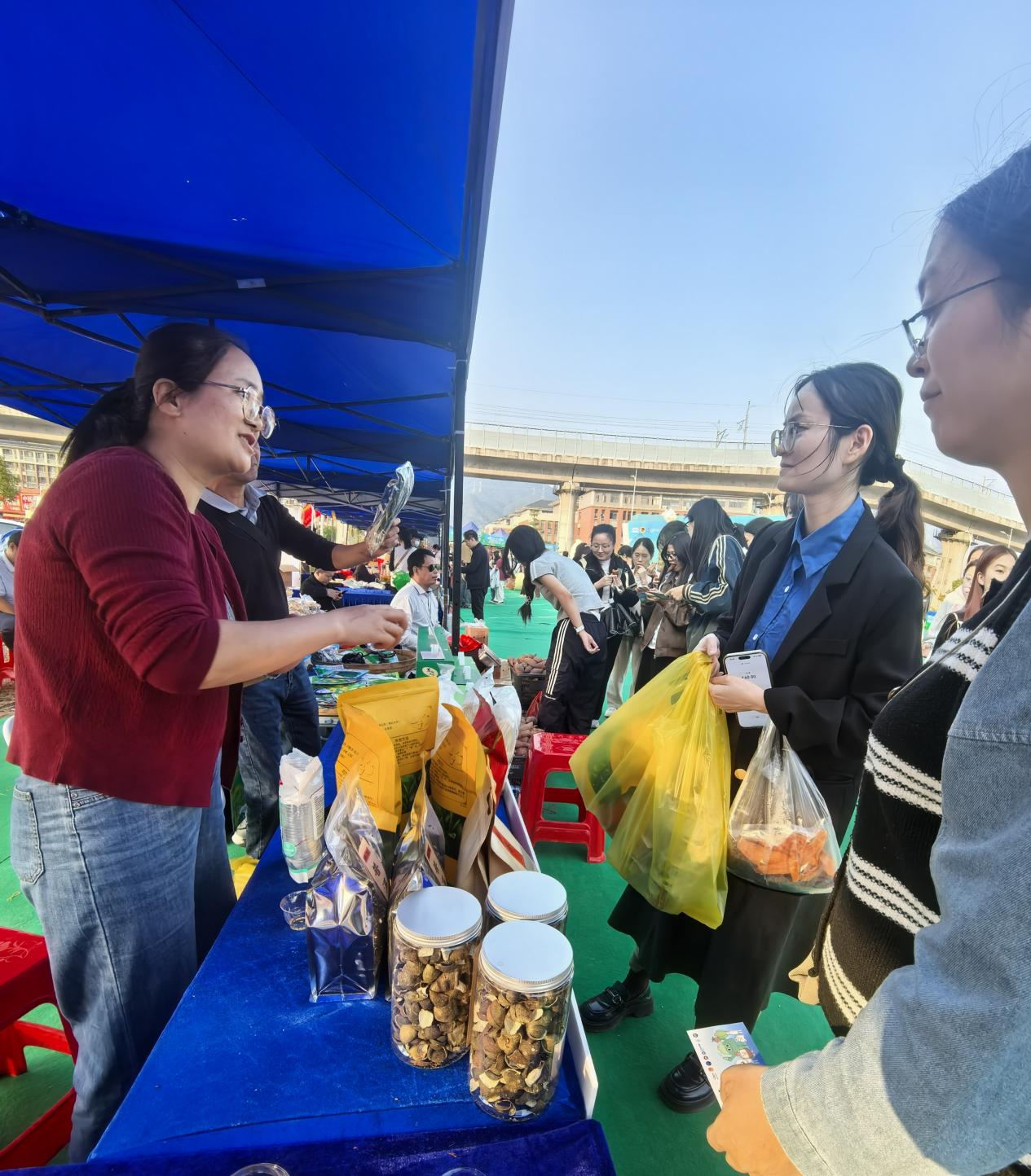 买,买,买!12月5日上午,暖阳高照。“天赋风土,自在清远”2025清远市暖冬消费季主题系列活动——消费帮扶产品推广暨“五大百亿+”农产品进校园活动在广东财贸职业学院清远校区启动,该校及省职教城其他院校的师生和市民闻讯而来,一边品尝一边购物,不亦乐乎。广东财贸职业学院工会一位老师一口气买了五百多块钱的土特产,有连南腊肠、英德牛肉丸、“飞来峡”盐焗清远鸡,物美价廉,喜形于色。