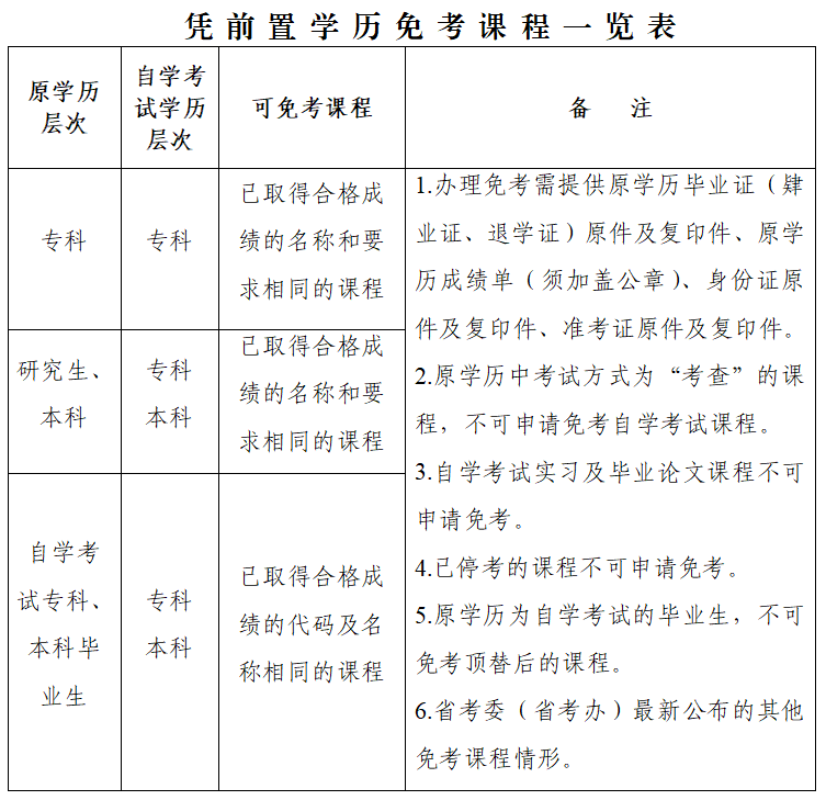 国家承认学历的各类高等学校及自学考试专科以上(含专科)的毕业生(肄业生、退学生)报考自学考试,可按有关规定申请免考已学过并考试成绩合格的有关课程。本科结业可视同专科学历,可使用结业的合格成绩办理专科层次课程的免考。