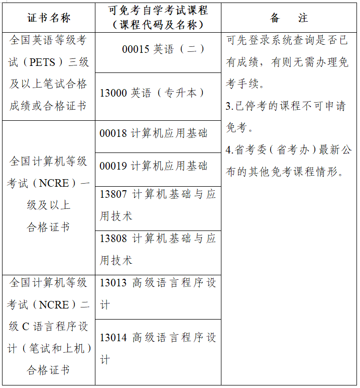此外,目前可申请免考自学考试课程的证书包括学历证书和全国计算机等级考试(NCRE)、全国英语等级考试(PETS)、大学英语四六级考试(CET)的相关等级证书。在外省或2005年前考取的等级证书办理免考手续的,视查验证书实际所需时间顺延。