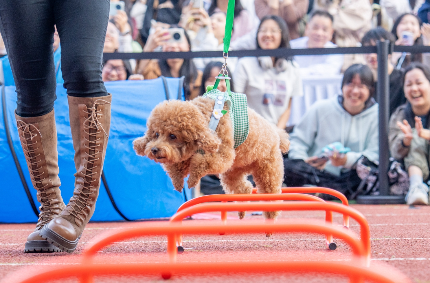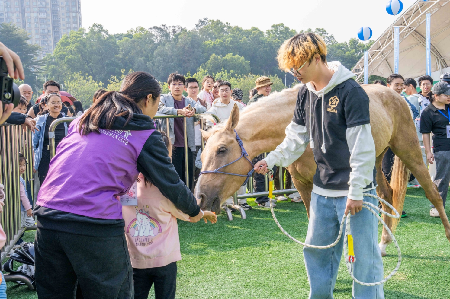 宠物服饰展示环节,可爱的“毛孩子”们或身着“疯狂动物城”主题服饰、或头戴中式簪花、或身着华丽礼服,百变造型令人眼花缭乱。萌宠运动会上,主人带领宠物绕柱、钻洞、跨栏,引得观众纷纷拍照记录。华农紫荆马协则将学校饲养的骏马“摩卡”带到现场,向观众们科普马的相关知识。
