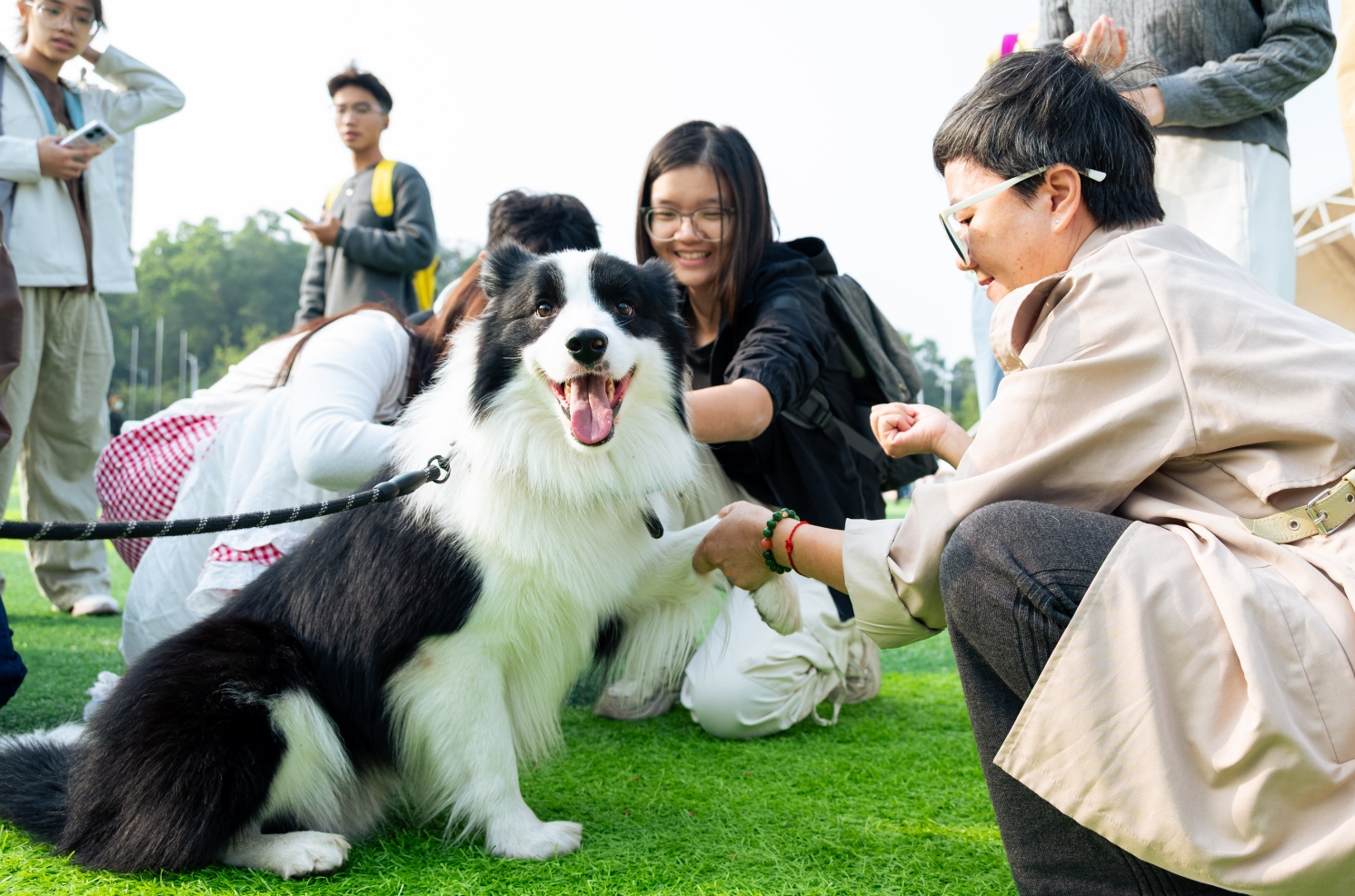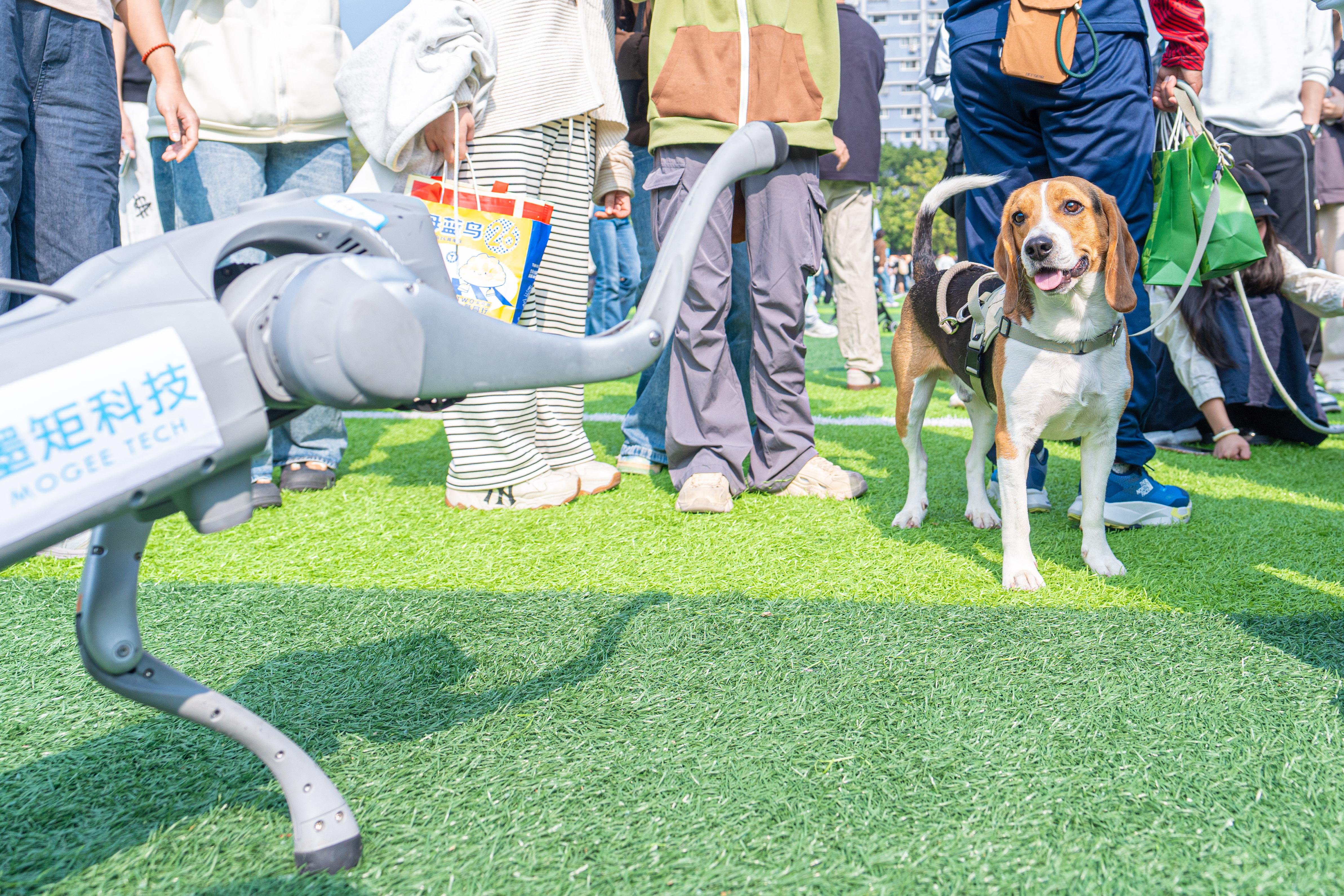 小狗“奔奔”坐着特制的轮椅,在草地上灵活移动,吸引了许多目光。在被发现时,它的腰部已经遭受了严重压伤。不过,在主人张卉的精心照料下,奔奔的病情已经有了不少好转,性格也变得愈发开朗活泼。还有游客将机器狗带到现场,令不少好奇的小狗上前观察、嗅探。“期末备考的焦虑完全被治愈了!”沉浸式体验“毛孩子”互动后,华农外国语学院2024级学生余延馨发出感慨。