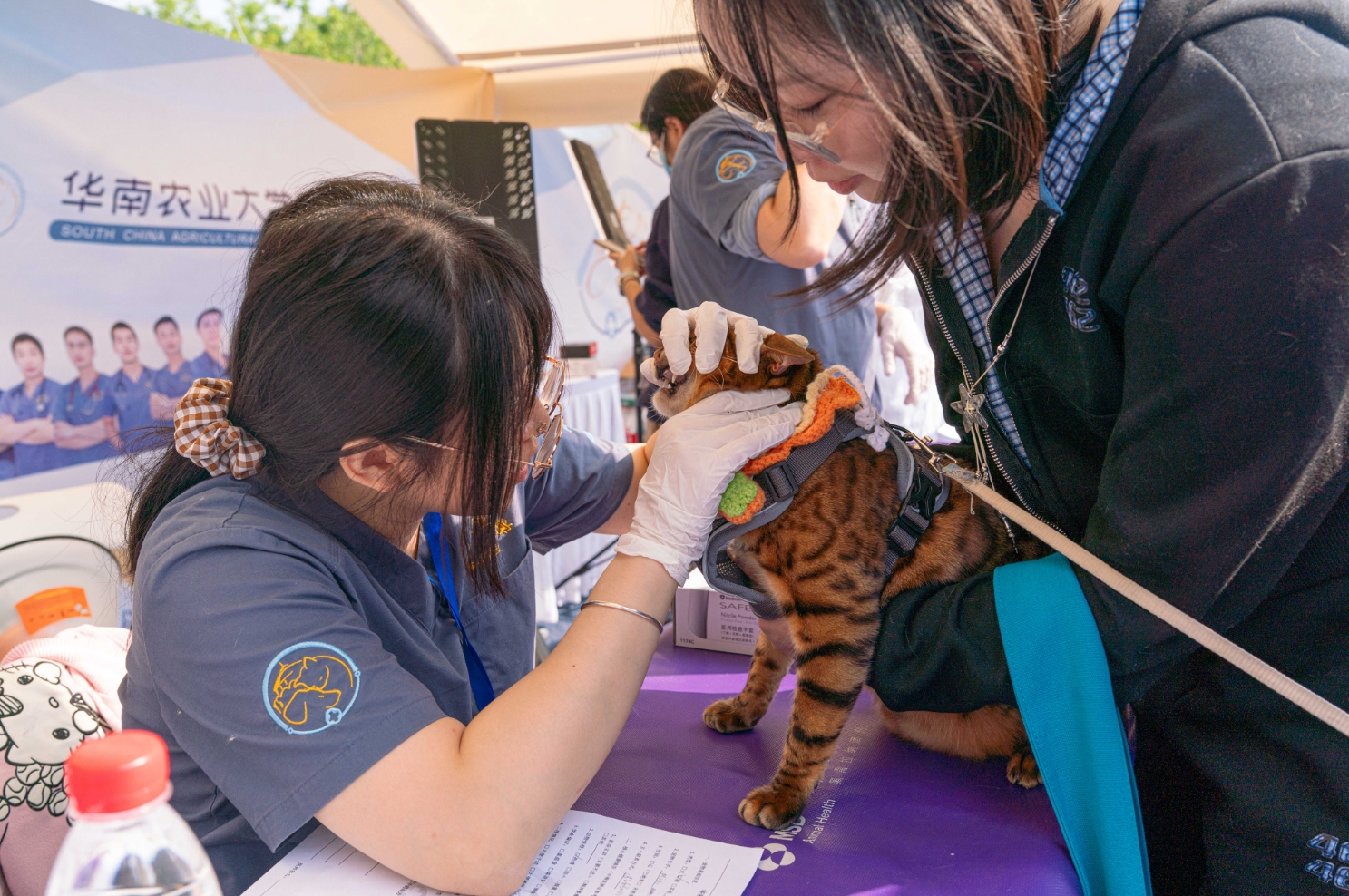 义诊摊位前,携宠前来的主人们排起了长龙。除了全科,宠物义诊专区还设置了中兽医、营养、肿瘤、骨科等专科摊位。通过面对面的检查与问诊,动物医生为宠主提供健康咨询与初步诊疗服务,科普养宠知识。其中,中兽医专科尤其引人注目。