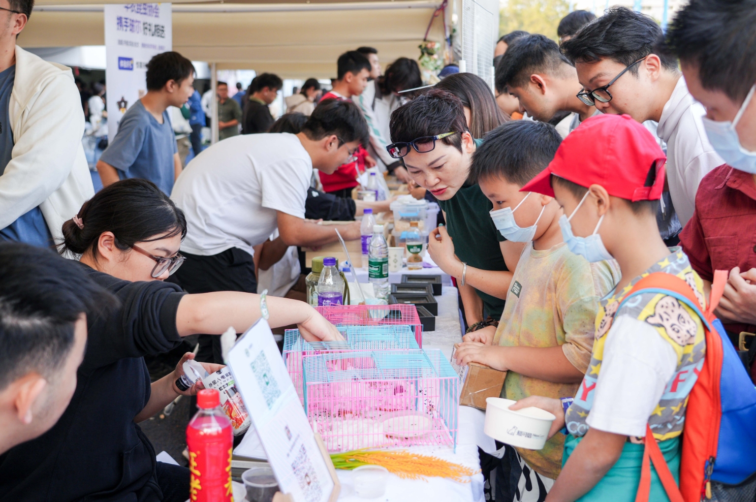 草坪上,不少小朋友正仔细端详刚领到的仓鼠。“华农研学-小农宝”摊位工作人员、华农人文与法学学院2023级学生陈冰霓分享道:“我们希望能通过科学饲养仓鼠的过程,培养小朋友们对宠物的责任心,形成对生命负责的态度。”
