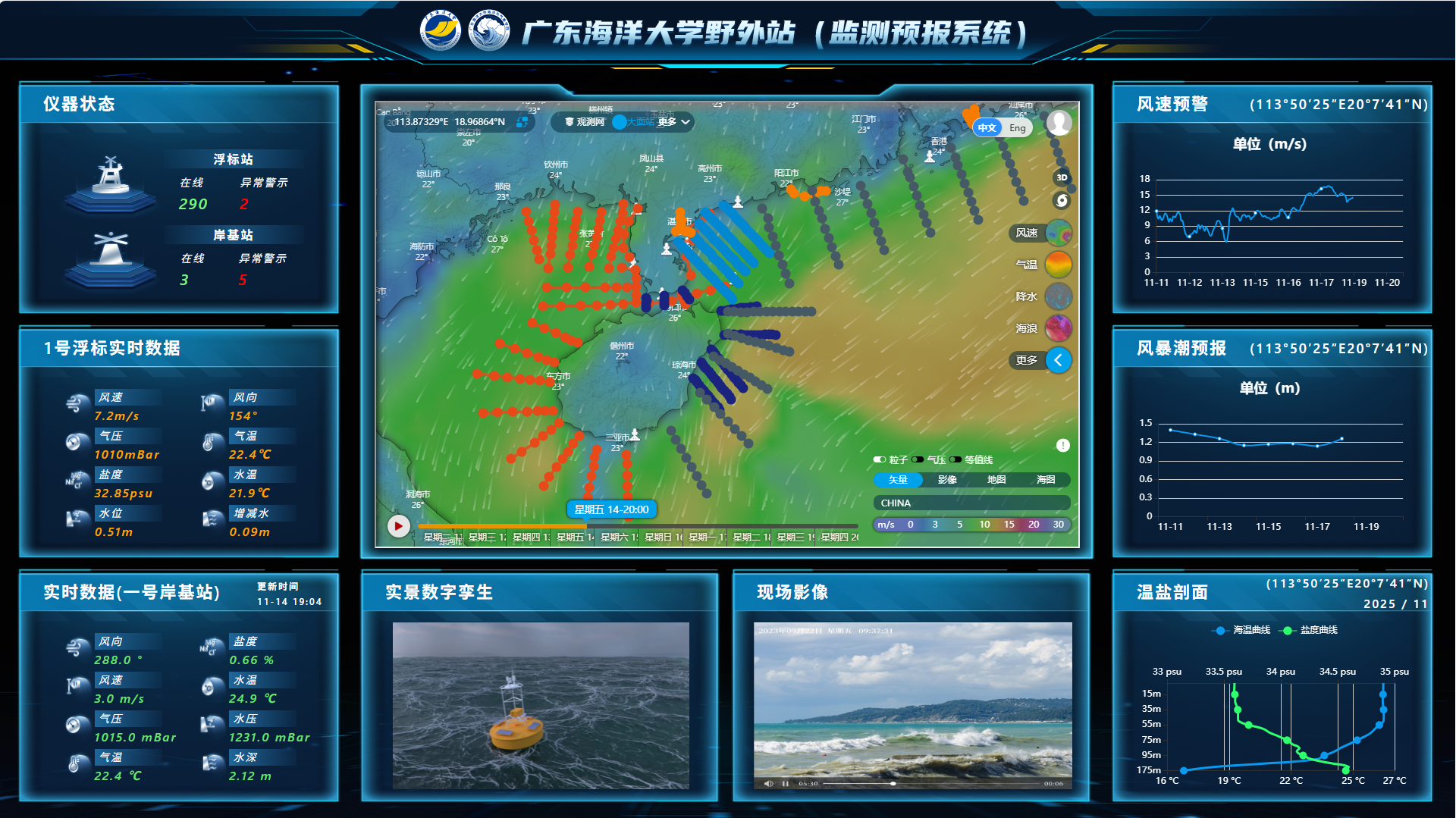 如今,预警系统覆盖粤西全域牧场,2024年“粤西海洋牧场防灾减灾示范平台”获省级“双百行动”二等奖。但郑少军也指出挑战:“近岸观测设备易受生物附着影响,成果转化‘最后一公里’还需打通。”学院正计划深化“监测-预报-防控”全链条平台,并与东南亚国家共享防灾技术。