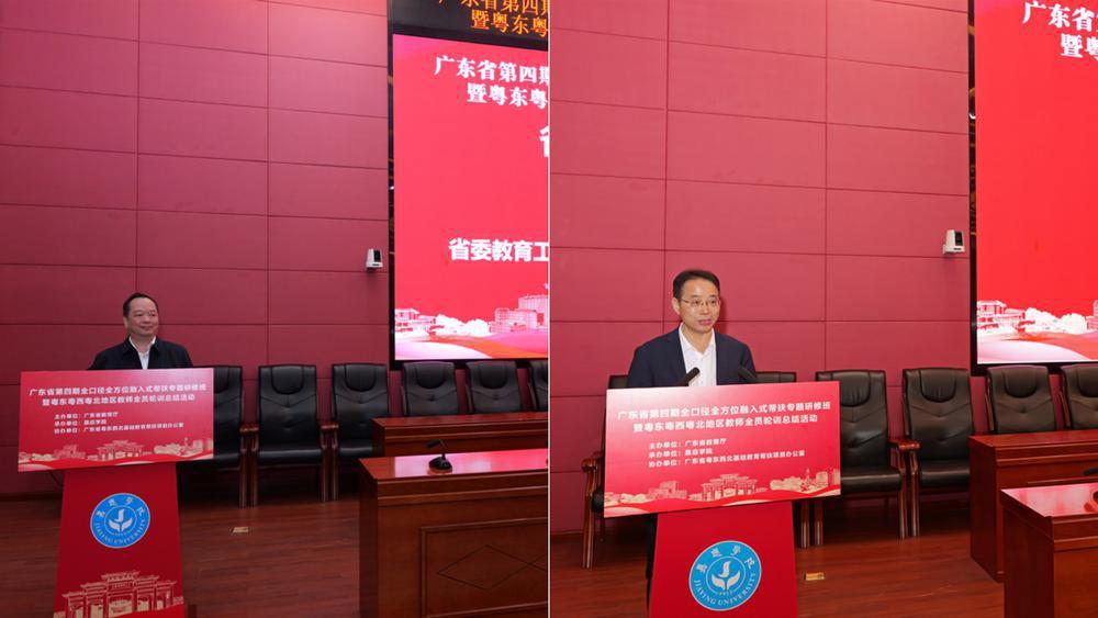 开班仪式上,韶关学院副校长田广增,梅州市教育局副局长罗涤权,广东第二师范学院教师发展学院副院长于慧,揭阳市教育局党组成员、市人民政府教育督导室副主任督学、二级调研员林柔链等单位代表,分别作为支援方、受援方、承训高校和轮训地市作了交流发言,分享了在推进“两全一融”帮扶及教师全员轮训工作中的创新实践与阶段性成果。