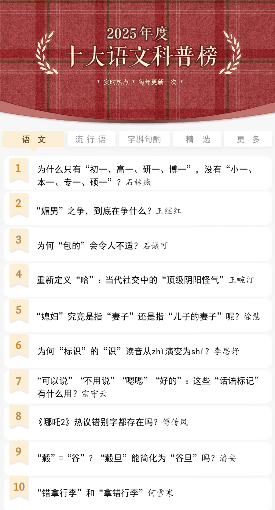 值得注意的是,2025年度一同发布的《语言文字周报》“十大语文科普榜”,汇总本年度语文科普知识的最新讨论,与“十大网络流行语”相配合,更全面地呈现年度语言腔调,引领规范的语言文字风尚,构建开放、多元、包容且富有活力的语文科普生态。《语言文字周报》执行主编杨林成介绍,“十大语文科普榜”中既有引发热议的语文事件,也有汉语的新用法、新规律,还有习焉不察的语言习惯背后隐藏的知识点。这里的“语文科普”,不仅是结合语言规范,对语文疑问作出回答,也是着眼于“活的语言”,允许某些问题“留白”,凸显语文科普的思维方式。
