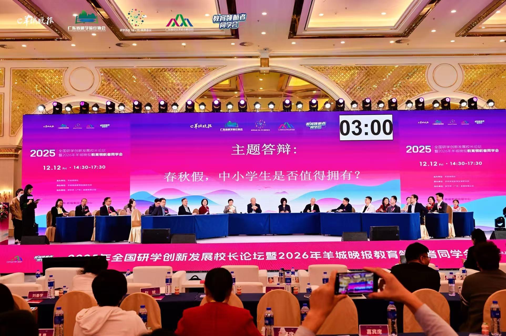 12月12日,由羊城晚报社、广东省研学旅行协会主办的2025年全国研学创新发展校长论坛暨2026年羊城晚报教育领航者同学会在广州举行。一场以“研学创新与教育未来:春秋假,破局与重生”为主题的思辩大会火热开展。