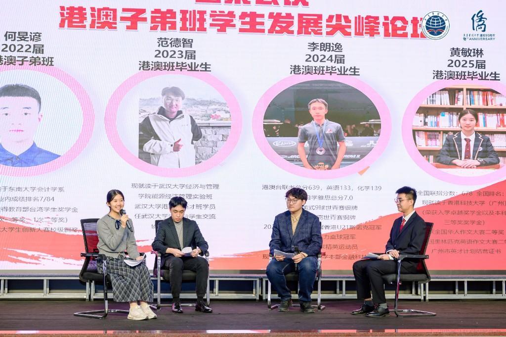 圆桌论坛环节。多位广东华侨中学港澳子弟班学生发展尖峰论坛优秀毕业生代表进行交流与分享。他们围绕学习经历、成长感悟、升学规划及大湾区发展机遇等话题展开交流分享,用真实的故事讲述了自己在港澳子弟班的蜕变与收获,展现了港澳青年扎根湾区、逐梦未来的青春风采。