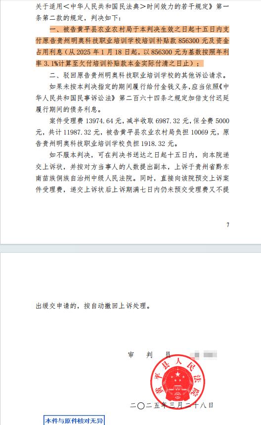 董先生向记者提供了黄平县人民法院在今年3月28日关于此案的判决书。法院认定2018年5月4日,被告黄平县农业农村局向第三人黔东南州应用技术培训学校印发了关于贫困劳动力全员培训的相关文件通知,明确为精准推进2018年贫困劳动力全员培训促进就业脱贫,黄平县农业农村局开展2018年贫困劳动力全员培训工作,确定引进黔东南州应用技术培训学校为2018年承担黄平县农业农村局农村贫困劳动力农业实用技术培训机构。双方明确该项目培训补贴金额共计1635900元。2020年年底黄平县农业农村局向黔东南州应用技术培训学校付款449400元、2024年2月7日黄平县农业农村局向黔东南州应用技术培训学校付款150000元。