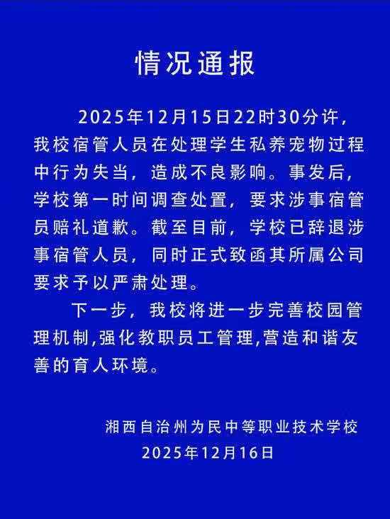 湖南湘西为民中等职业技术学校通报,12月15日22时30分许,学校宿管人员在处理学生私养宠物过程中行为失当,造成不良影响。事发后,学校第一时间调查处置,要求涉事宿管员赔礼道歉。截至目前,学校已辞退涉事宿管人员,同时正式致函其所属公司要求予以严肃处理。下一步,学校将进一步完善校园管理机制,强化教职员工管理,营造和谐友善的育人环境。