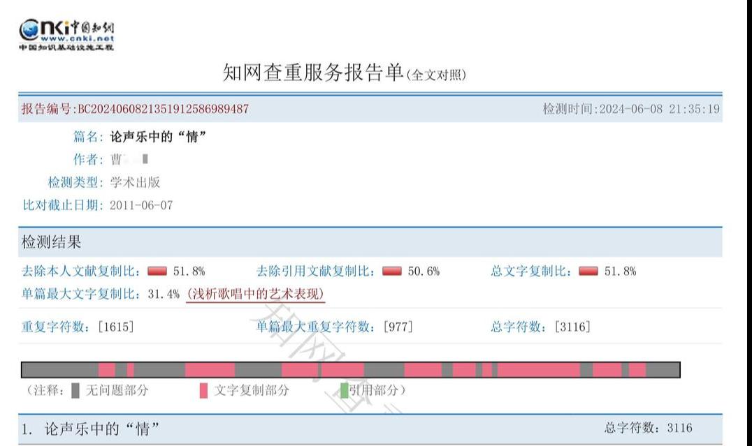 根据中国知网资料,曹某某2010年11月24日在《大众文艺》上发表《简谈中国歌剧发展的三次高潮》,2011年6月7日在《黄河之声》上发表《论声乐中的“情”》。爆料人提供的知网查重服务报告单显示,《论声乐中的“情”》总文字复制比为51.8%,《简谈中国歌剧发展的三次高潮》总文字复制比为80.1%。