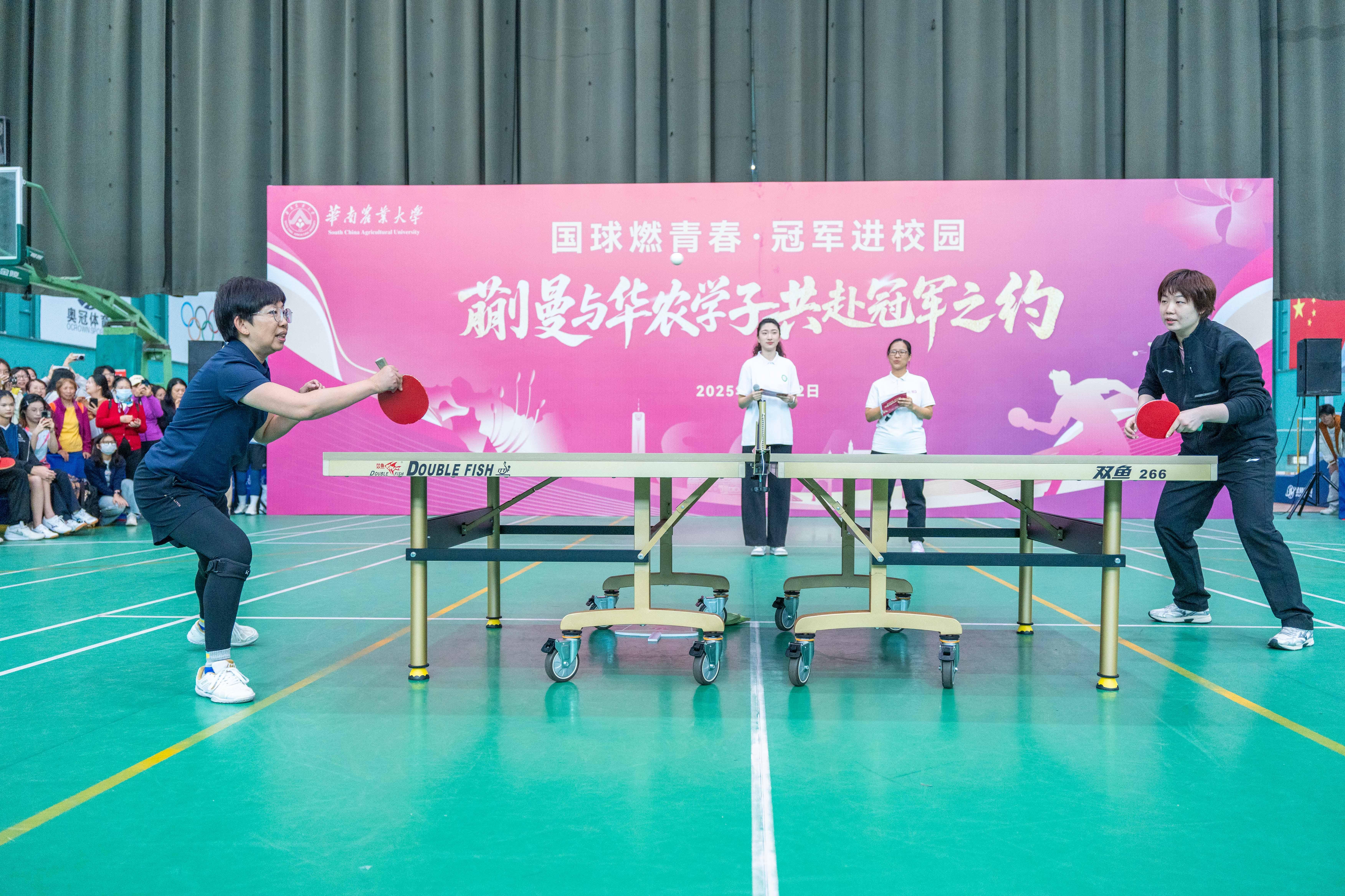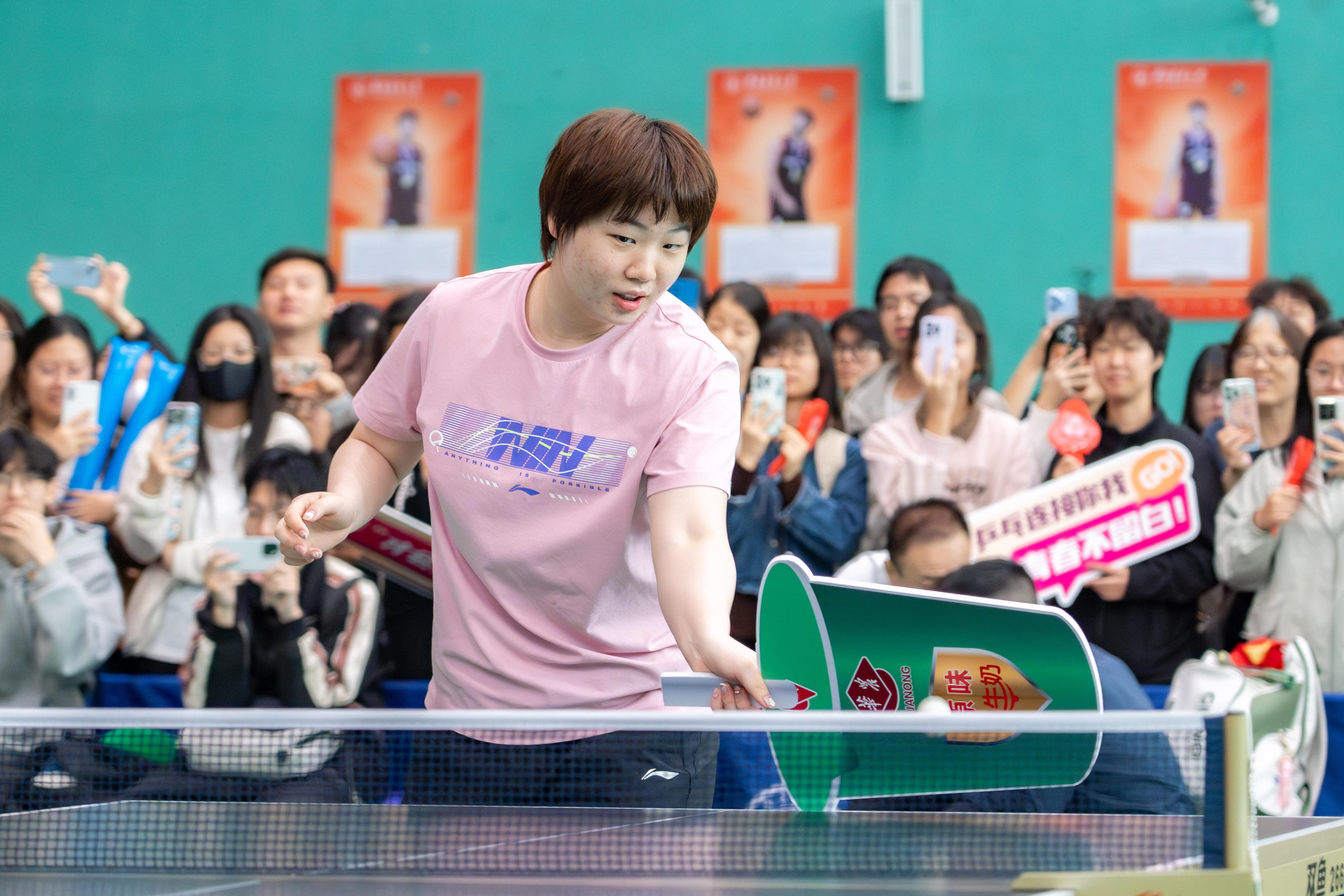 友谊赛将气氛推向高潮。单打环节,蒯曼与华农师生过招,她步伐轻盈、出手果断,精准的拉球与巧妙的变化引来阵阵喝彩。双打较量中,她先与妹妹蒯捷搭档组成“姐妹花”组合,与华农同学切磋;紧接着又与华农同学临时组队,彼此默契配合、补位及时,展现出顶尖运动员的适应力与团队意识。场上球来球往,场下掌声不断,短短几局,已是酣畅淋漓。