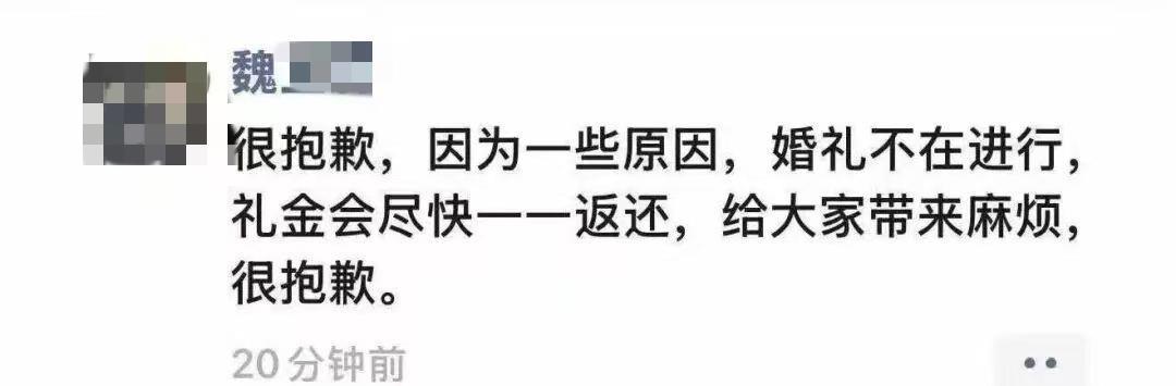 出阁宴当天,魏某还在朋友圈发过取消婚礼的通知。通知提到,因为一些原因,婚礼不在(再)进行,礼金会尽快一一返还。知情者告诉记者,出阁宴当天魏某发布这条朋友圈后不久又删除了。上述受访的婚庆服务人员表示,婚礼前一天,魏某通知化妆师,婚礼取消,不打算结婚了。