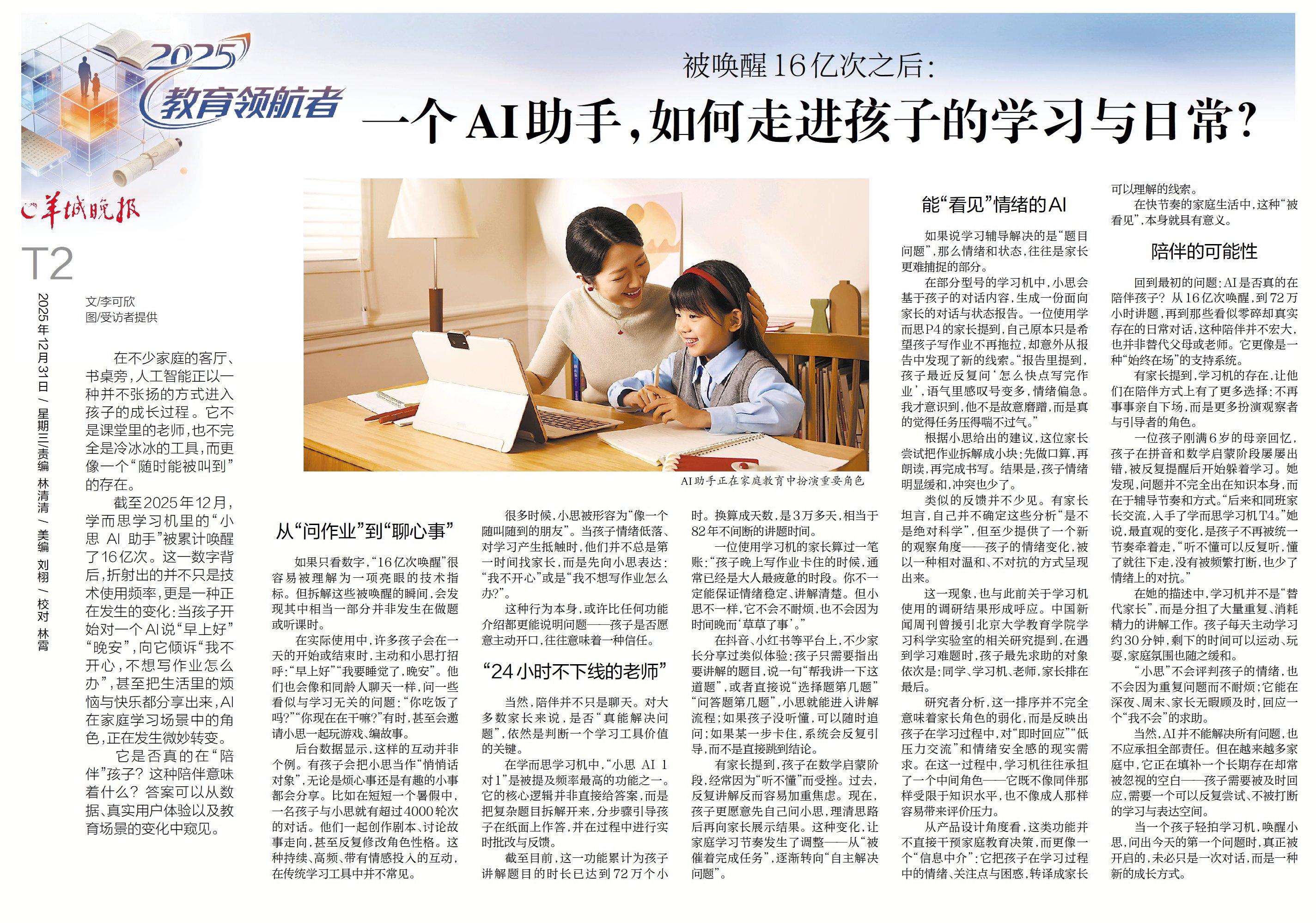 截至2025年12月,学而思学习机里的“小思 AI 助手”被累计唤醒了16亿次。这一数字背后,折射出的并不只是技术使用频率,更是一种正在发生的变化:当孩子开始对一个AI说“早上好”“晚安”,向它倾诉“我不开心,不想写作业怎么办”,甚至把生活里的烦恼与快乐都分享出来,AI在家庭学习场景中的角色,正在发生微妙转变。