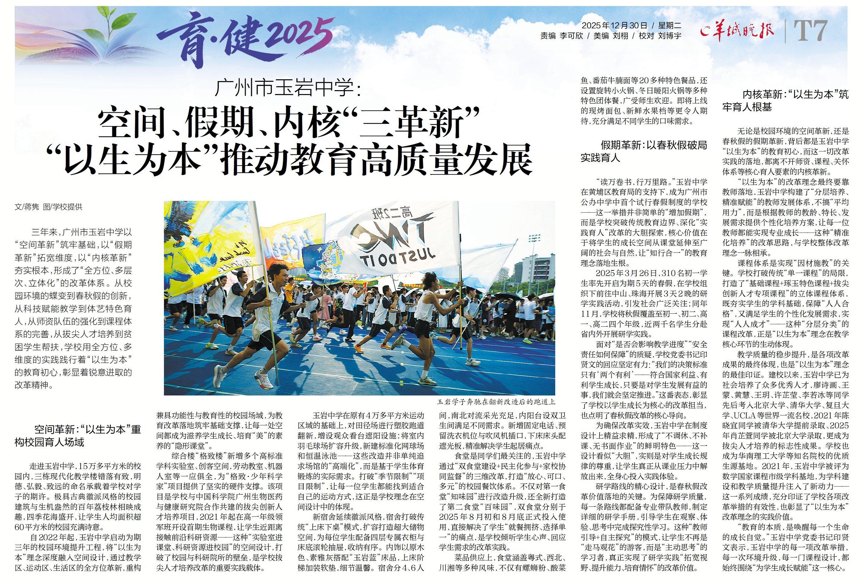 三年来,广州市玉岩中学以“空间革新”筑牢基础,以“假期革新”拓宽维度,以“内核革新”夯实根本,形成了“全方位、多层次、立体化”的改革体系。从校园环境的蝶变到春秋假的创新,从科技赋能教学到体艺特色育人,从师资队伍的强化到课程体系的完善,从拔尖人才培养到贫困学生帮扶,学校用全方位、多维度的实践践行着“以生为本”的教育初心,彰显着锐意进取的改革精神。