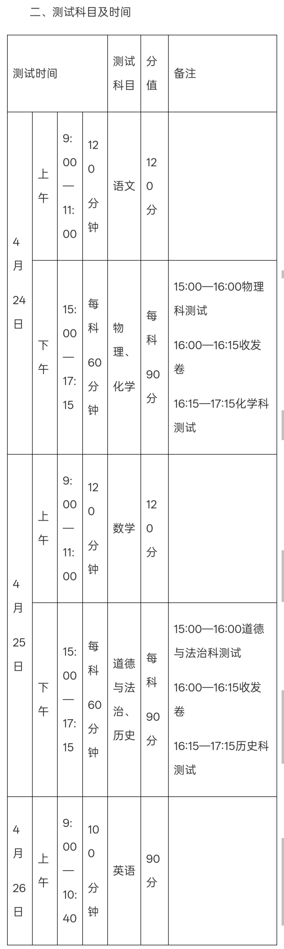 (二)测试科目:语文、数学、英语、道德与法治、历史、物理、化学。
