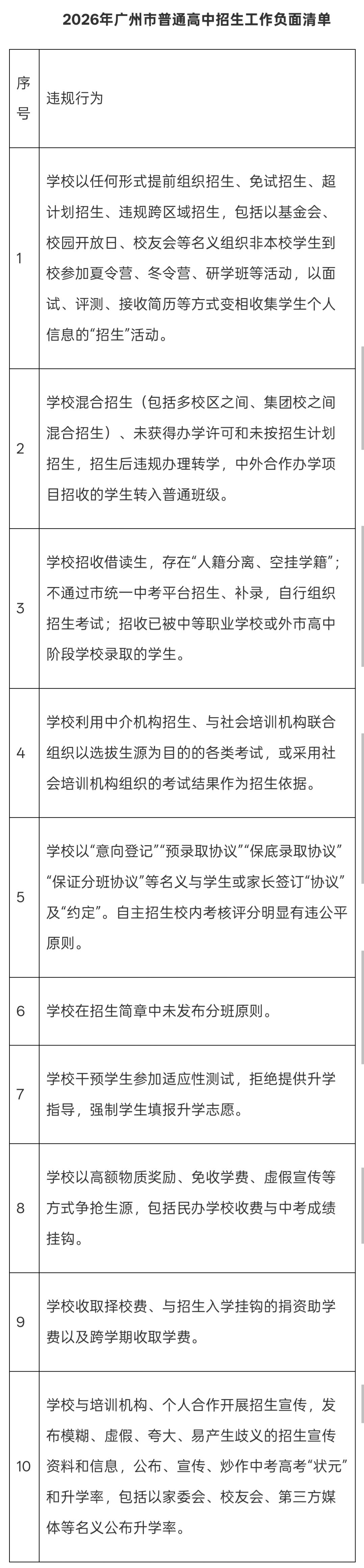 广州市教育局表示,为全面贯彻党的教育方针,落实立德树人根本任务,切实维护教育公平,根据教育部办公厅《关于开展基础教育“规范管理提升年”行动的通知》,深化招生规范治理工作,在《广州市高中阶段学校考试负面清单》基础上,结合实际,制定《2026年广州市普通高中招生工作负面清单》。