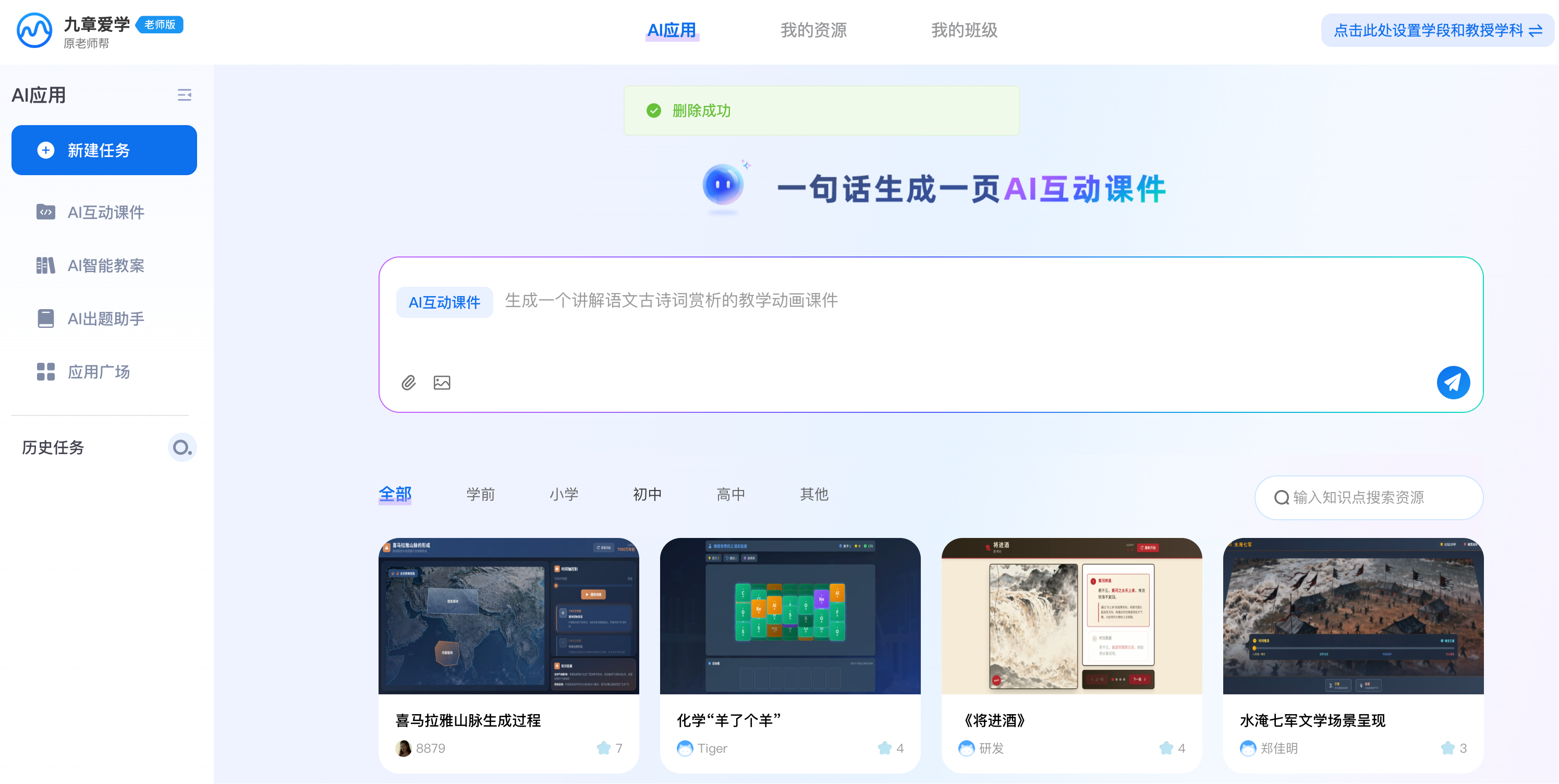 目前,老师可以使用九章爱学老师版获得170多个AI智能体的支持。比如在备课时,不仅可以使用“AI交互课件”,也可以用“PPT转教案”、“跨学科设计”等功能;在考试、出题时,可以使用“举一反三出题”、“智能组卷”等智能体;在班级管理时可以借助“班级积分榜”、“智能排座”的支持,甚至有“高情商回复”、“表扬生成器”这类趣味助手。