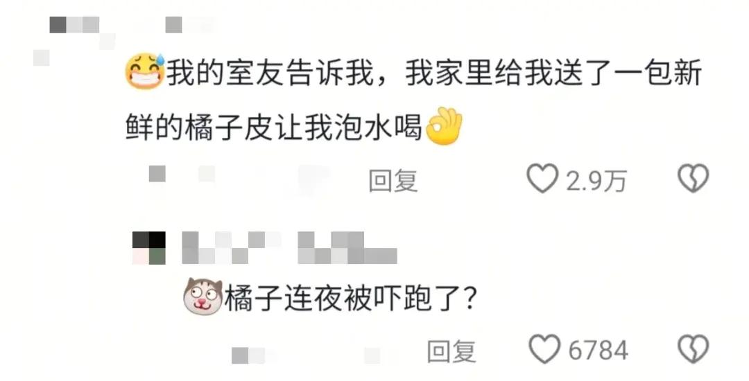 家里寄来一箱橘子,出门取个快递的工夫回来只剩一堆皮,舍友还贴心提醒:“你家给你送了一包新鲜橘子皮泡水喝”。同学:“新鲜刚剥出来的吧……”