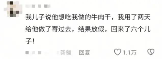 “给儿子寄了自己做的牛肉干结果放假回来了六个儿子”,网友排队留言:“还缺儿子不。”