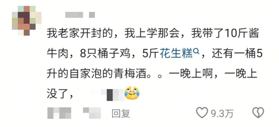 10斤酱牛肉、8只筒子鸡、5斤花生糕、5升青梅酒……吃完这些,一个人或许需要很久,但一个宿舍只需要一晚上。网友:“好硬的一顿啊”。