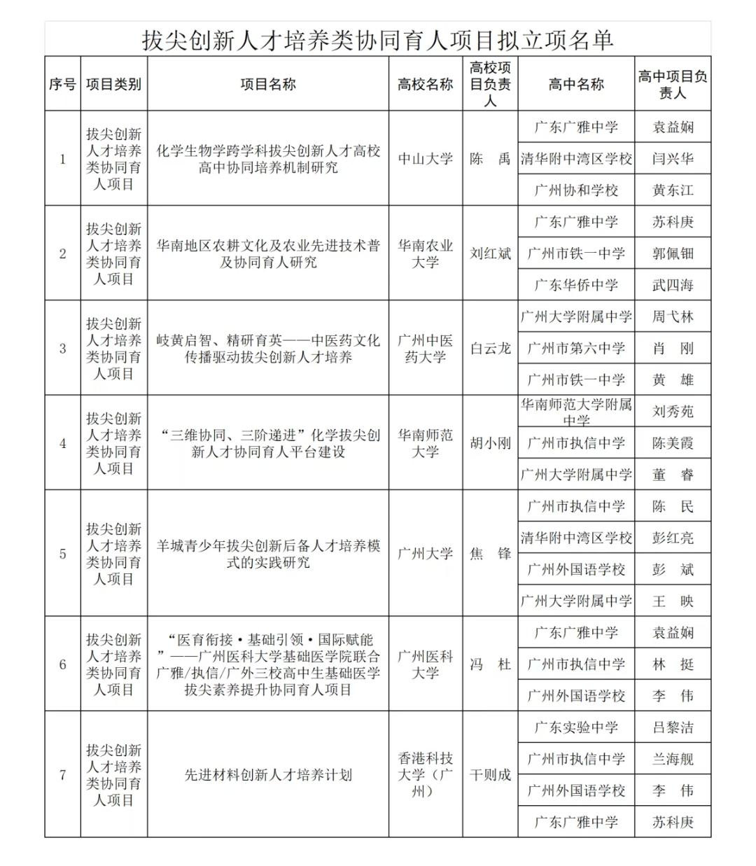 在高校拔尖创新人才培养类协同育人项目名单中,中山大学、华南农业大学、广州中医药大学、华南师范大学、广州大学、广州医科大学、香港科技大学(广州)等7所高校将与广州11所高中开展拔尖创新人才培养类协同育人项目。具体情况如下: