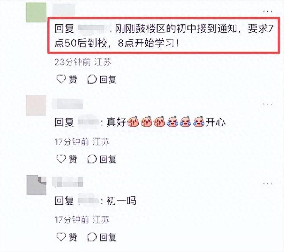 有家长表示:鼓楼区的初中接到通知,要求7点50后到校,8点开始学习!