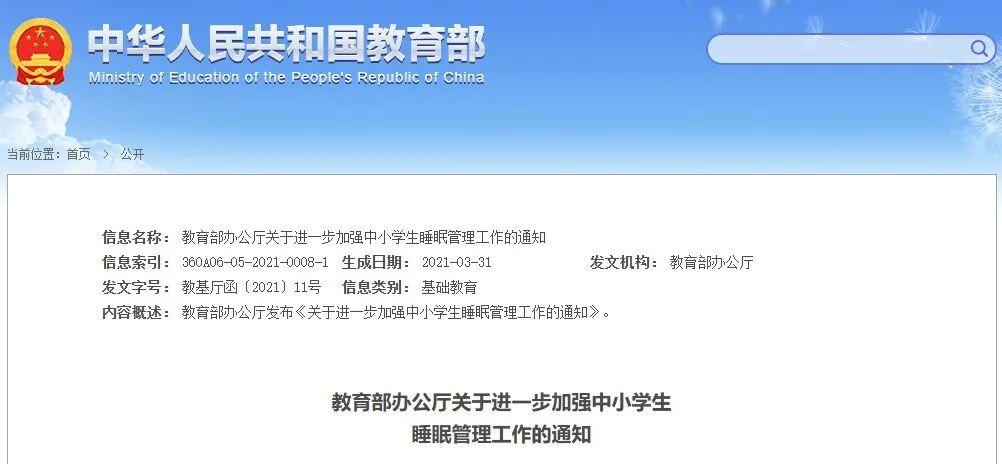 据此前报道,教育部官网2021年印发了一则《关于进一步加强中小学生睡眠管理工作的通知》。