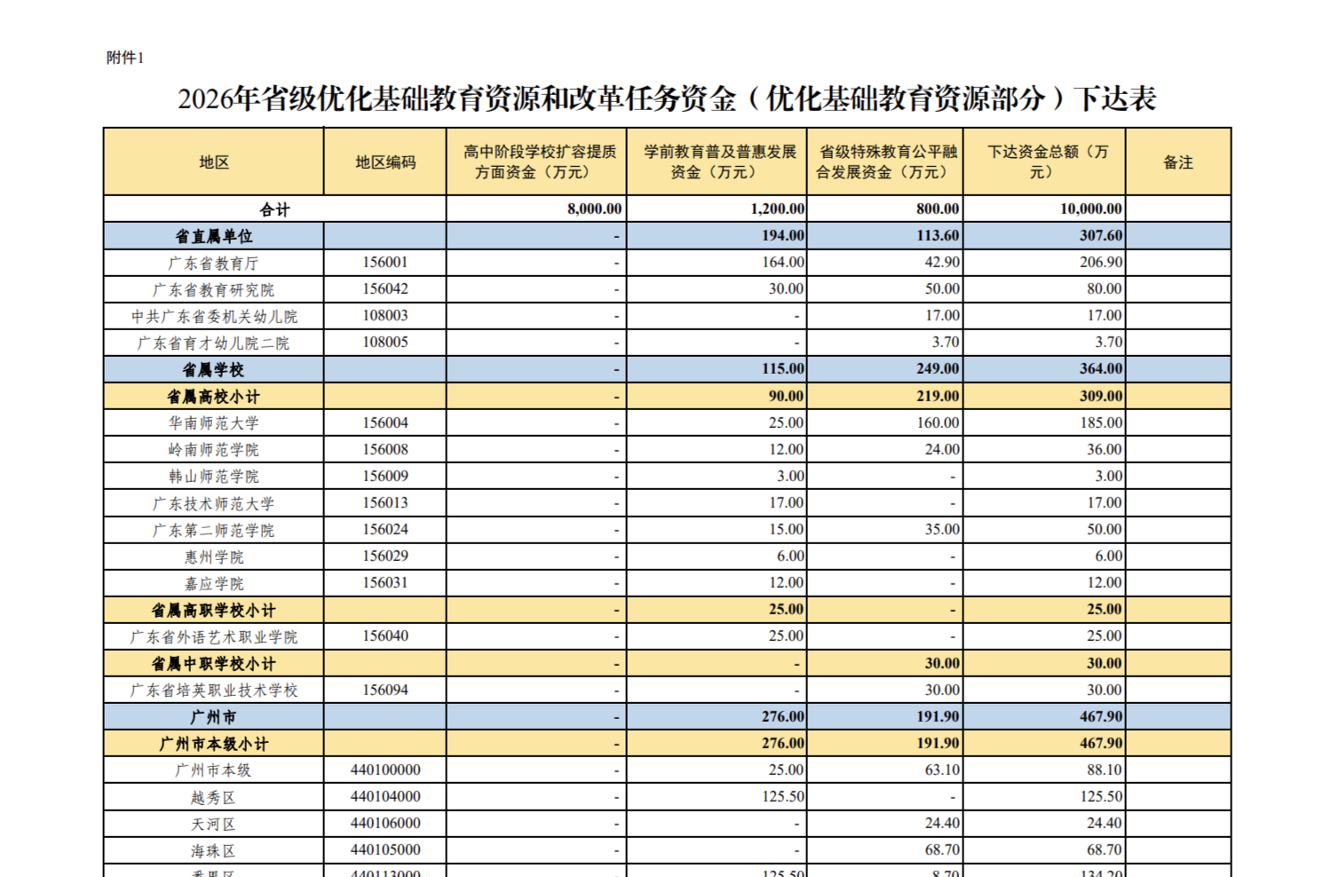 在总计1亿元的“优化基础教育资源”资金中,高中阶段学校扩容提质独占8000万元,成为重中之重。资金集中投向学位需求压力较大的地区,韶关、惠州、肇庆、清远、潮州、揭阳、云浮七市各获得超过1140万元的专项支持,显示出省级层面对于扩充优质高中学位的强力决心与精准布局。