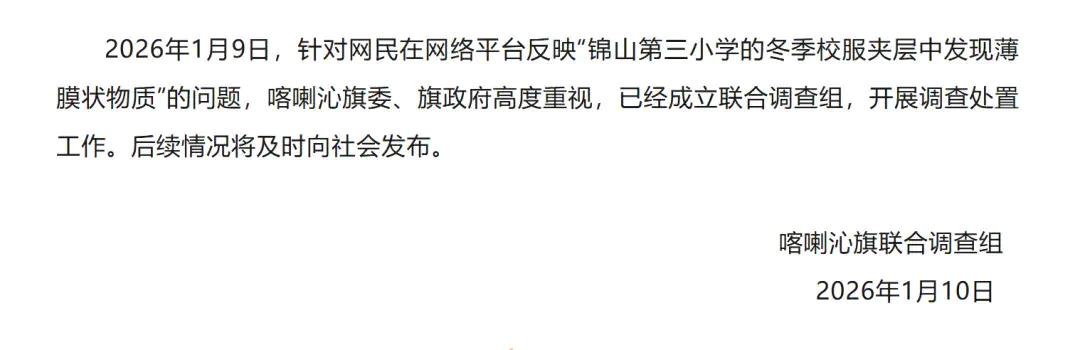 2026年1月9日,网民发布视频反映“锦山第三小学的冬季校服夹层中发现薄膜状物质”,引起社会关注。喀喇沁旗委、政府高度重视,立即成立由旗教育、市场监管、公安、审计等部门组成的联合调查组,通过走访询问、实地调查、留样复检等方式,对此事进行全面核实处理。现将有关情况通报如下。