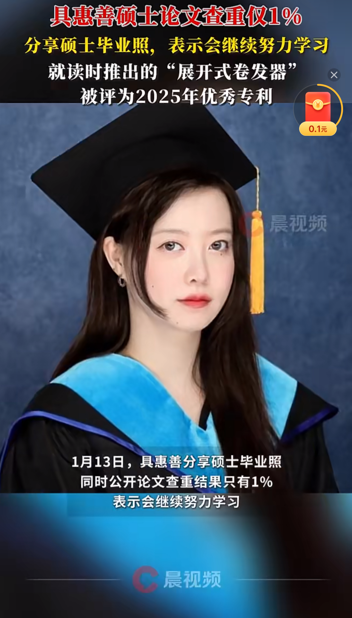 1月13日,具惠善分享硕士毕业照,同时公开论文查重结果只有1%,表示会继续努力学习。