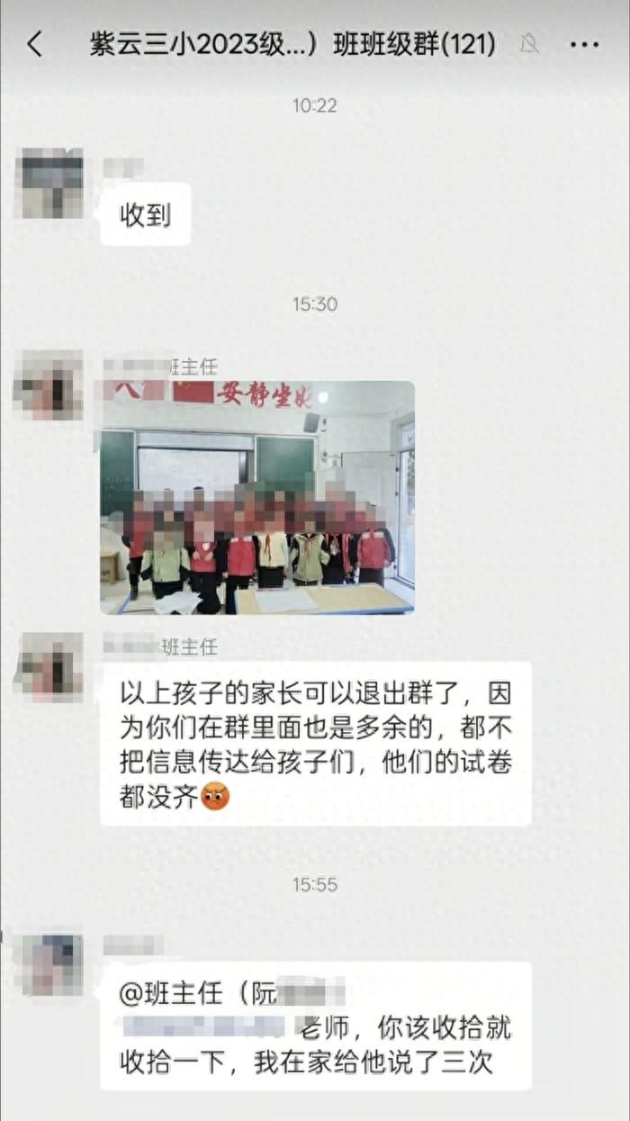 近日,有网友在社交平台发布一张班级微信群聊天截图称,贵州省安顺市紫云自治县第三小学某班级班主任阮某某在班级微信群晒出10多名未交齐试卷的学生照片后,称上述学生家长在群里“多余”,可以退群了,此事引发关注。