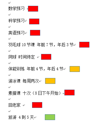 “寒假太短,要做的事情太多了!”一份不断增长的清单让她烦躁,“自主学习初中数学、科学、英语,每天看纪录片,体能训练班,游泳课保持水感,羽毛球10节课,新增网球入门,重拾素描课程……”每一项后面都用不同颜色标注着优先级,但红色标记的“必须做”项目已经几乎占据了假期的四分之三。