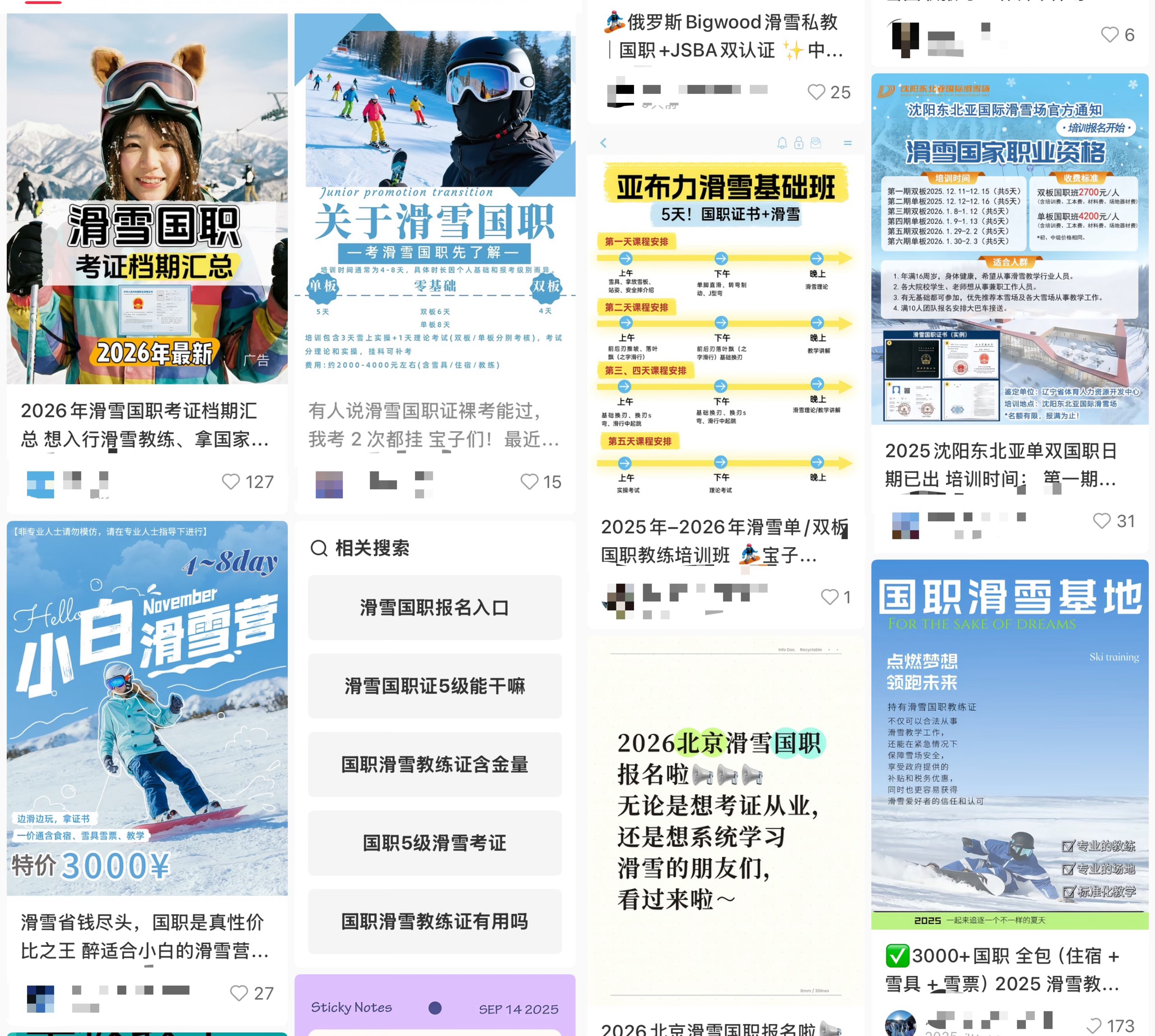 培训和考试,串起了获得资格证书完整流程的两端。记者在社交媒体平台搜索发现,一些培训机构或招生代理宣传的“滑雪教练国职证”培训班,普遍是针对学员考取“滑雪社会体育指导员(五级)国家职业资格证书”开设的,培训分为单板、双板,时间通常为5到7天,地点覆盖全国多地的雪场,价格3000元到7000元不等,培训结束后直接参加考试。