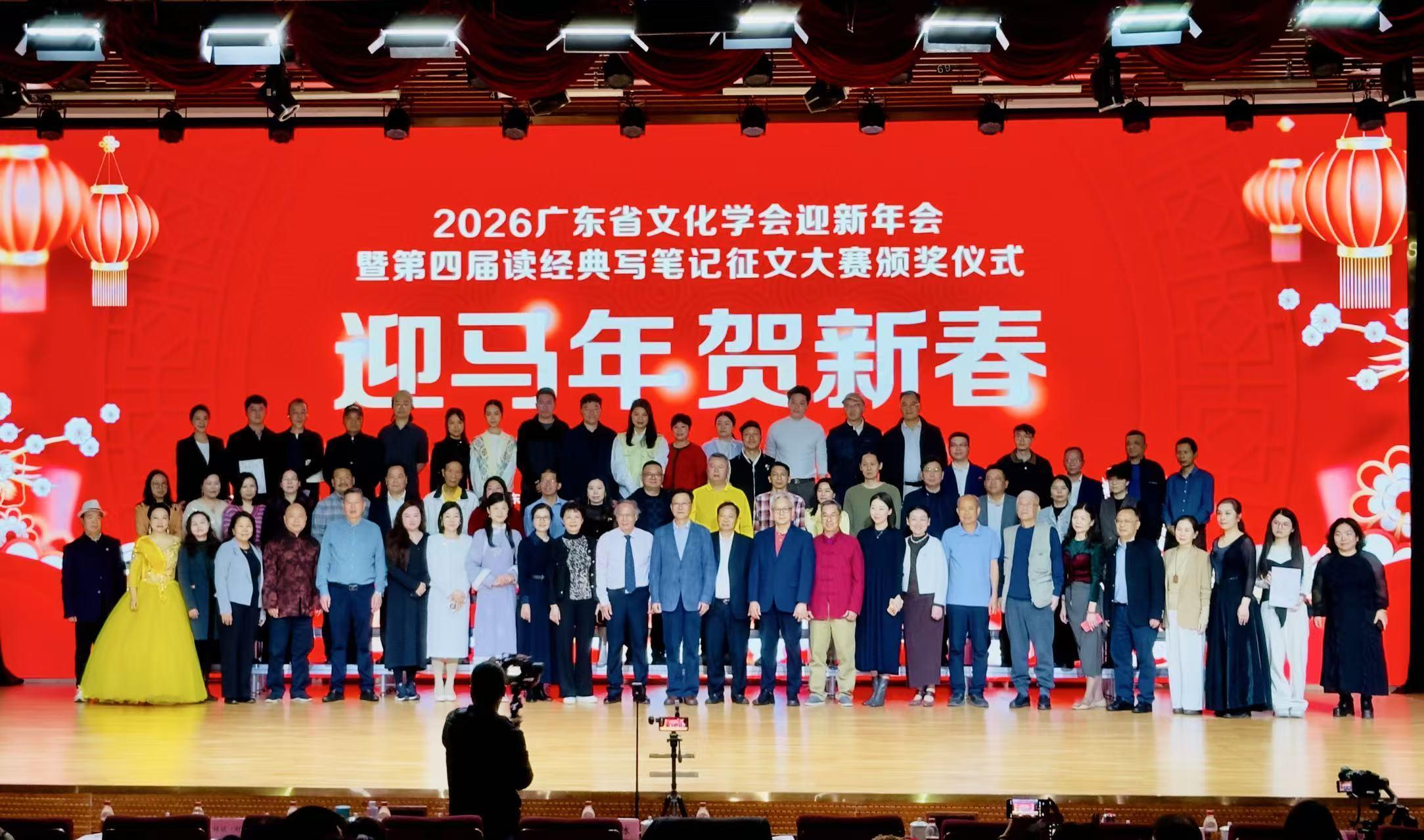 1月18日,广东省文化学会举行迎新年会暨第四届“读经典·写笔记”征文大赛颁奖仪式。活动汇聚学会顾问、领导、会员、获奖代表及文艺演职人员等两百余人,共同回顾过去一年的文化耕耘,展望新年发展蓝图,以一场充满人文气息的盛会迎接新春。