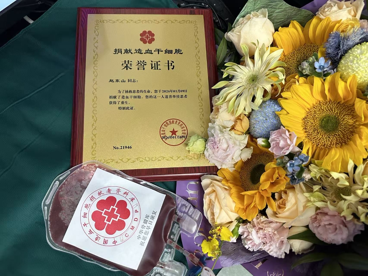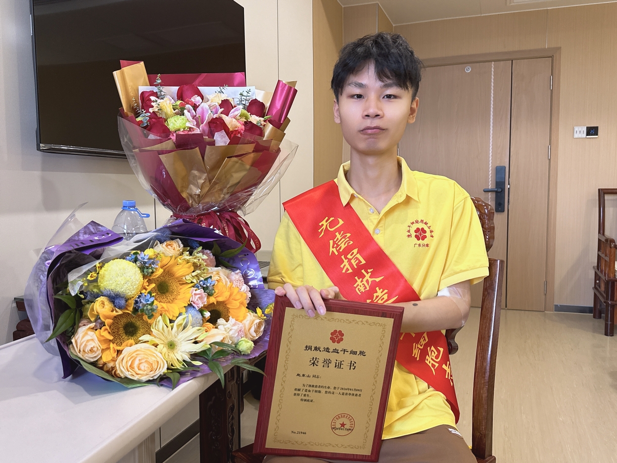 2022年,刚满18岁的大一新生赵东山在学校组织的无偿献血活动中登记加入中华骨髓库。2025年12月,正在期末备考的他接到广东省红十字会通知——他与一名重症患者HLA配型成功。“当时没想太多,只觉得如果我的一点付出能救一个人,那这件事就值得做。”面对捐献时间与期末考试、毕业设计的冲突,他毅然决定协调好课程安排并调整论文计划去拯救一个年幼患者的生命。家里人一开始担心会影响身体健康,他耐心地科普捐献安全无害。得知他捐献干细胞的决定后,学校予以充分肯定和全力支持,为他顺利捐献提供坚实保障。