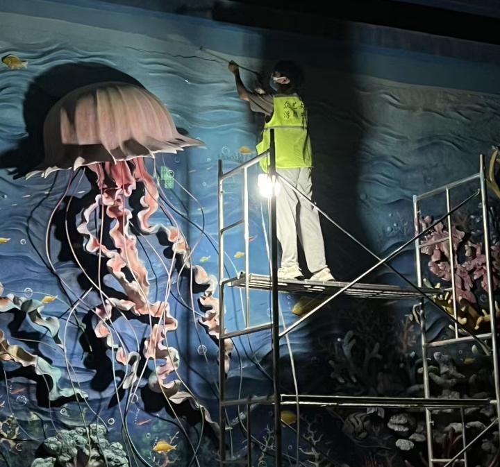 为了完成作品,他们付出了不少努力。小郭原本恐高,但浮雕创作常需登上十几米高的脚手架,为了不拖累进度,他硬着头皮反复尝试,最终战胜恐惧。“现在已经不恐高了,刚开始还真是挺吓人,但我不能不上呀,总不能一直让小民上。”